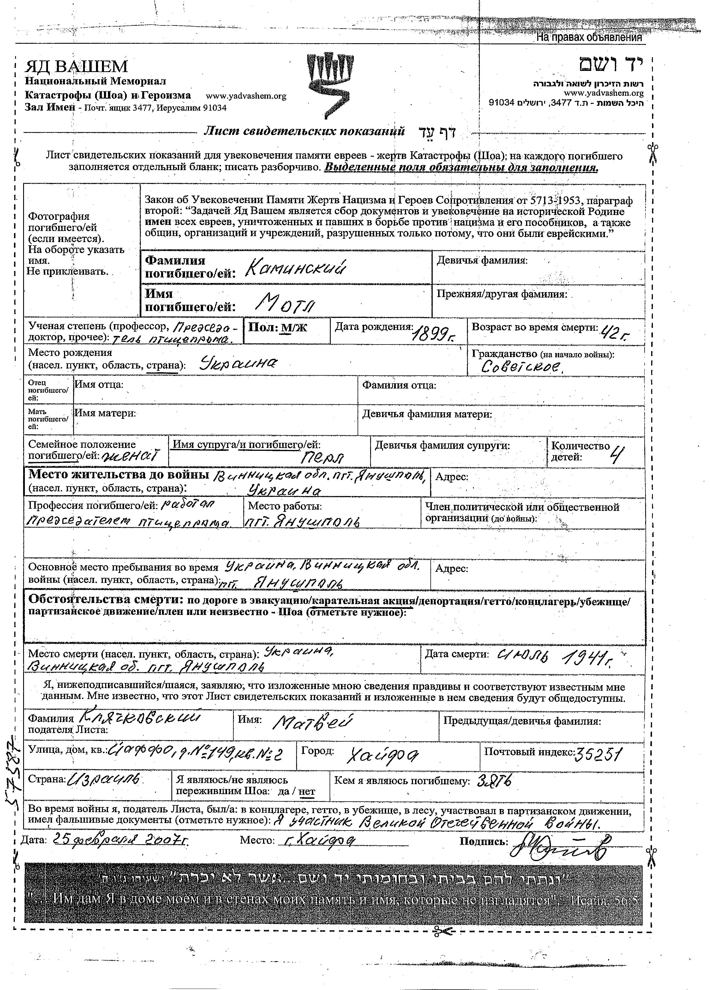 Kaminskiy Motl 1899 Yanushpol, Ukraine (URSS) Feuille de témoignage