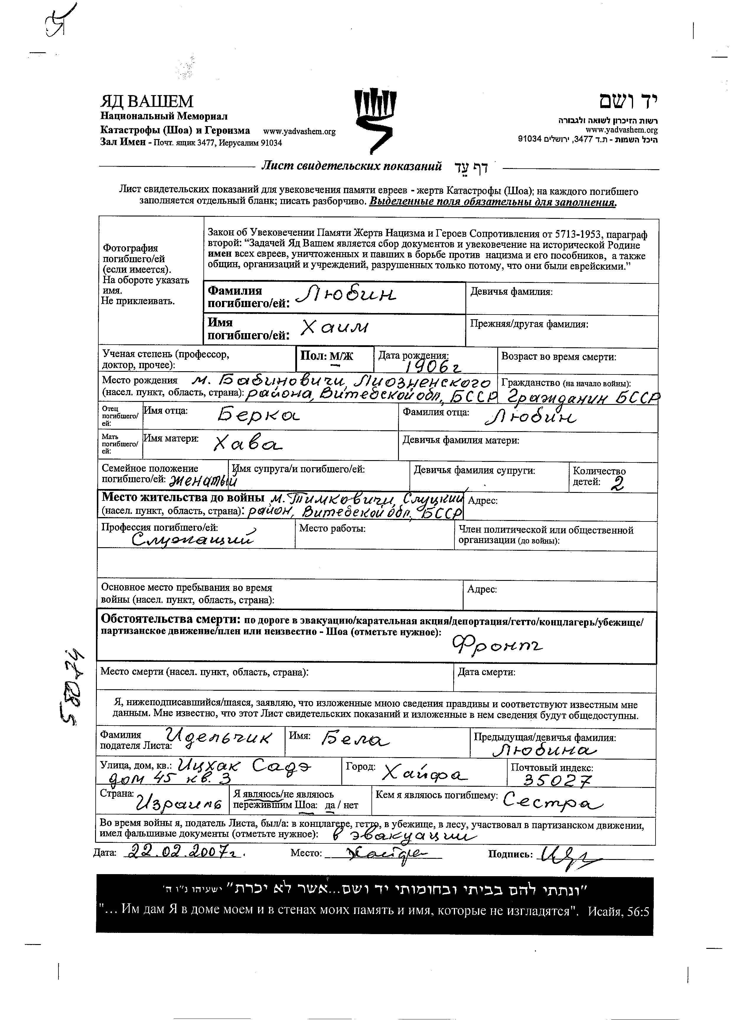 Lyubin Khaim 1906 Timkovichi, Bélorussie (URSS) Feuille de témoignage