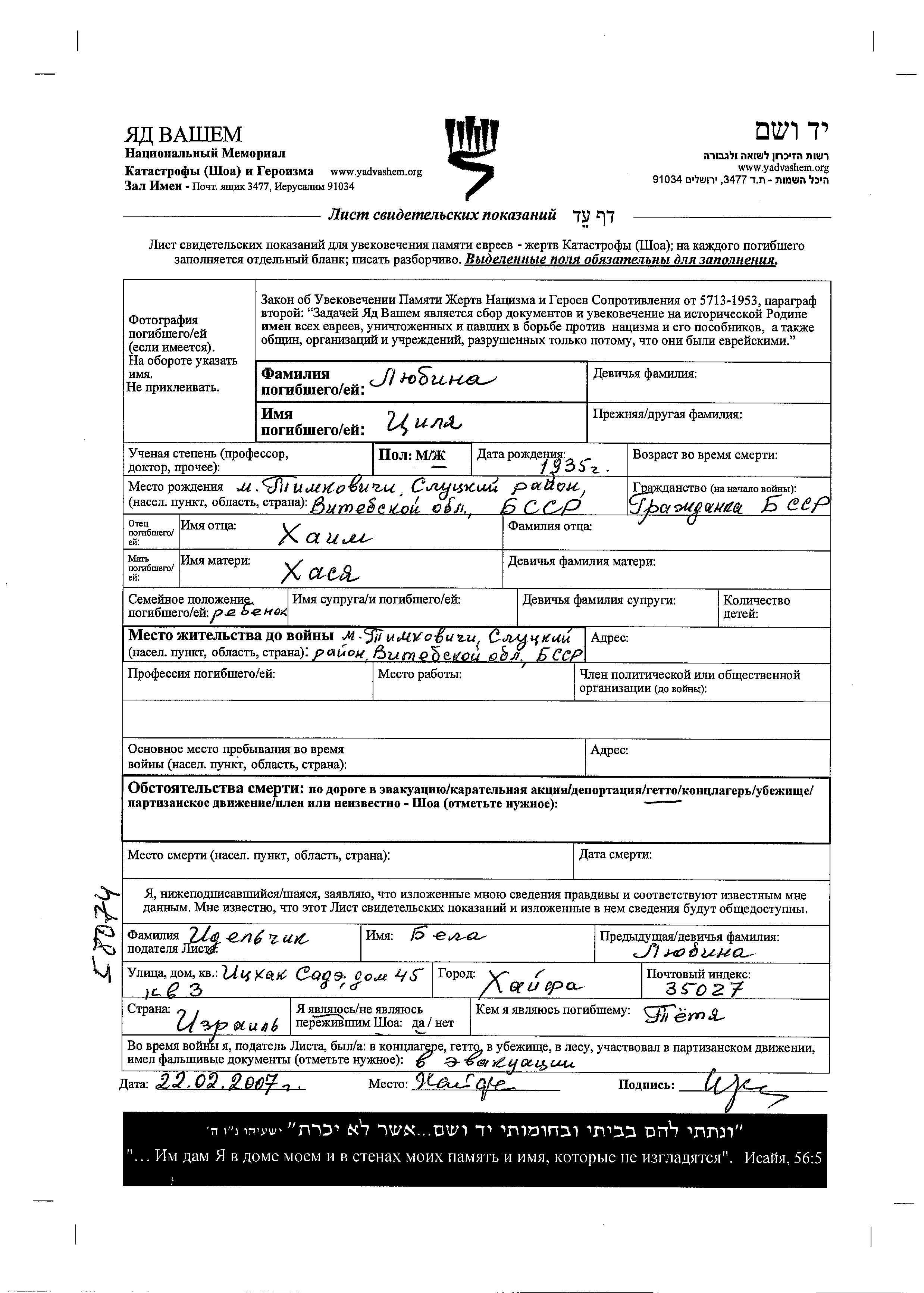Lyubina Tzilya 1935 Timkovichi, Bélorussie (URSS) Feuille de témoignage