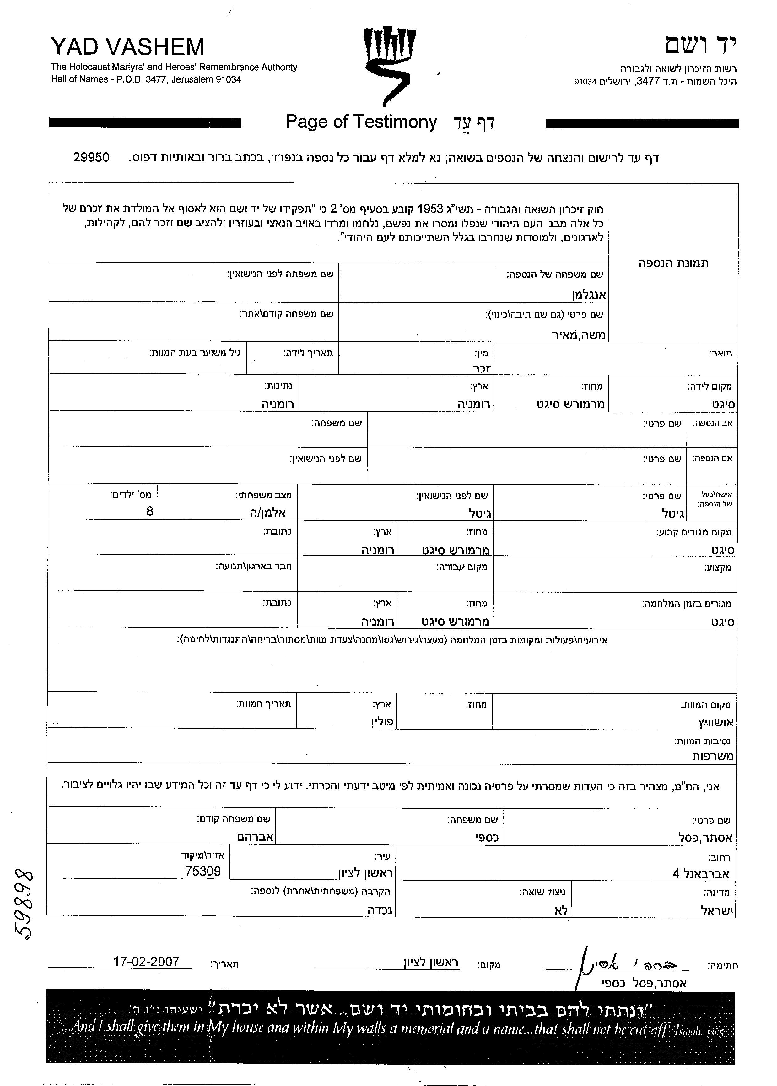 Engelman Meir Moshe Sighet, Roumanie Feuille de témoignage (digitale-signée)