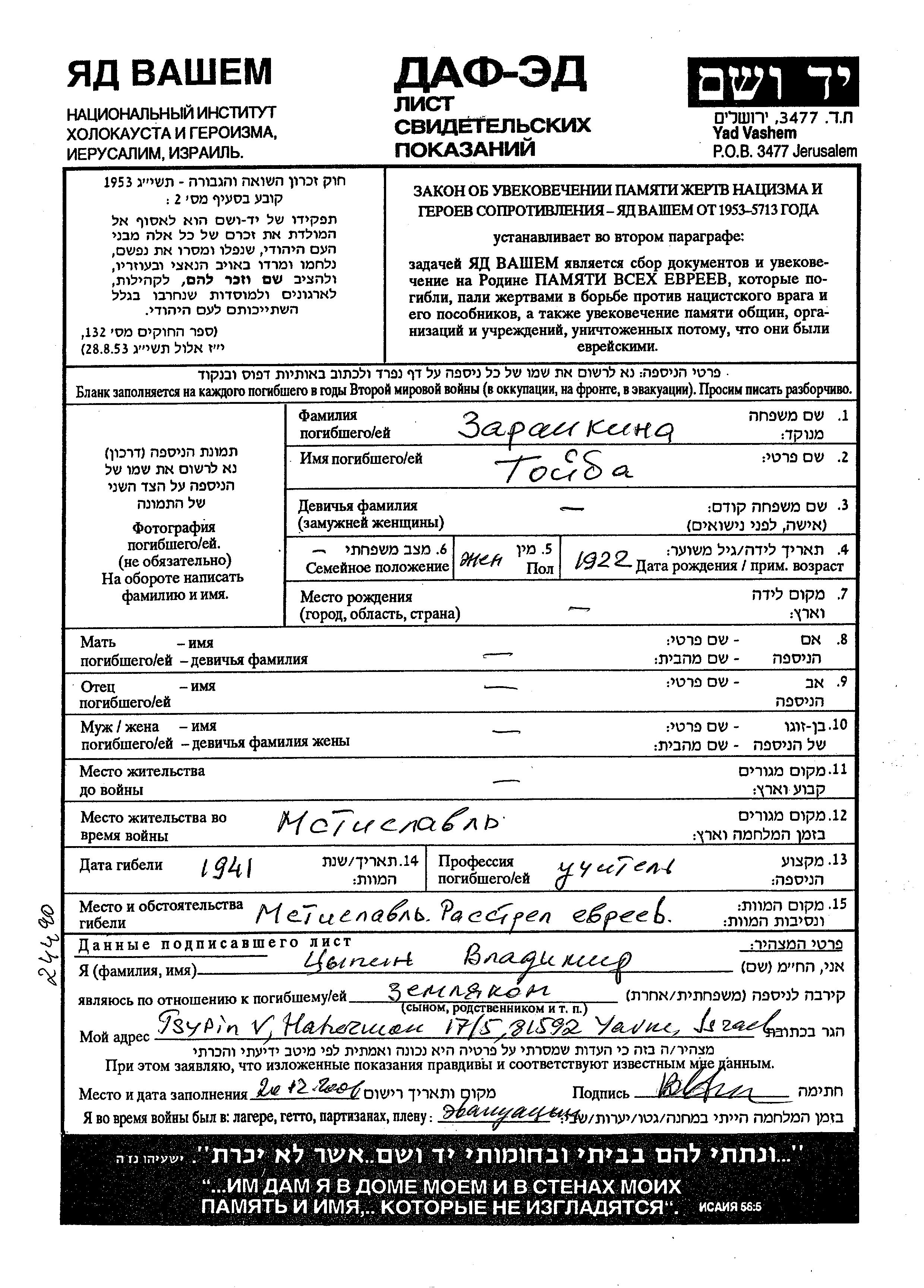 Zarankina Toyba 1922 endroit inconnu, Feuille de témoignage