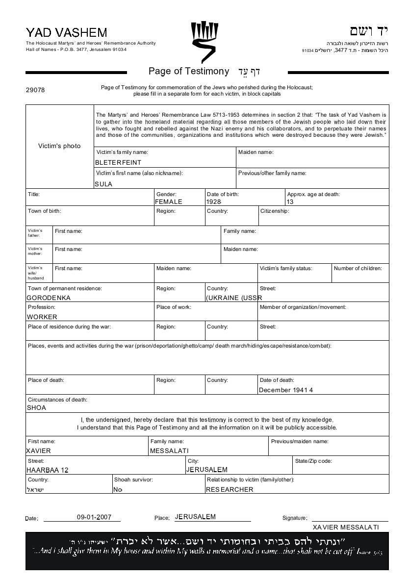 Bleterfeint Sula 1928 Gorodenka, Pologne Feuille de témoignage (digitale)