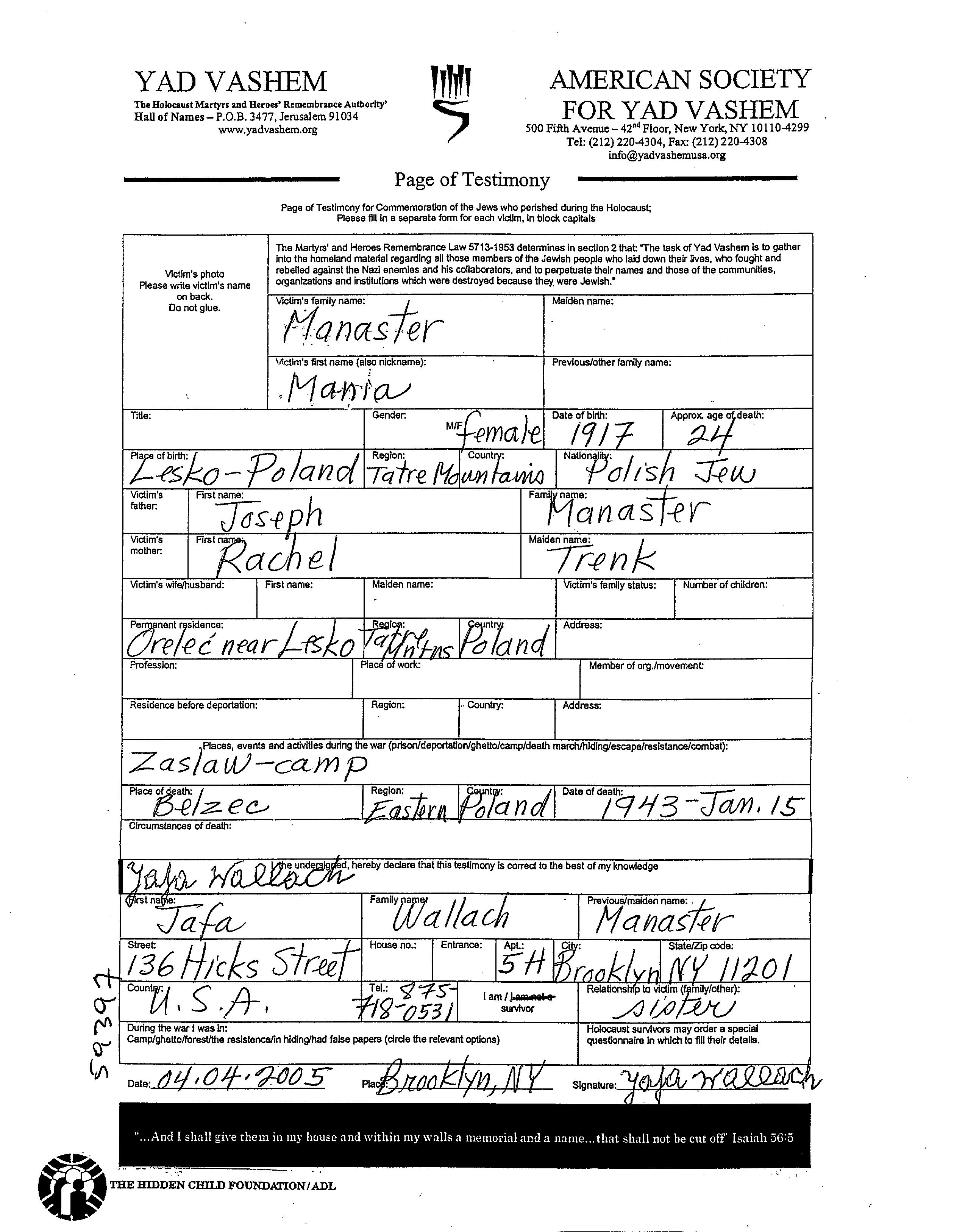 Mania Manaster est née à Lesko, Pologne en 1917, fille de Joseph et de Rachel née Trenk. Avant la seconde guerre mondiale elle vivait à Orelec, Pologne. Pendant la guerre, elle était à Zaslaw, Pologne.
