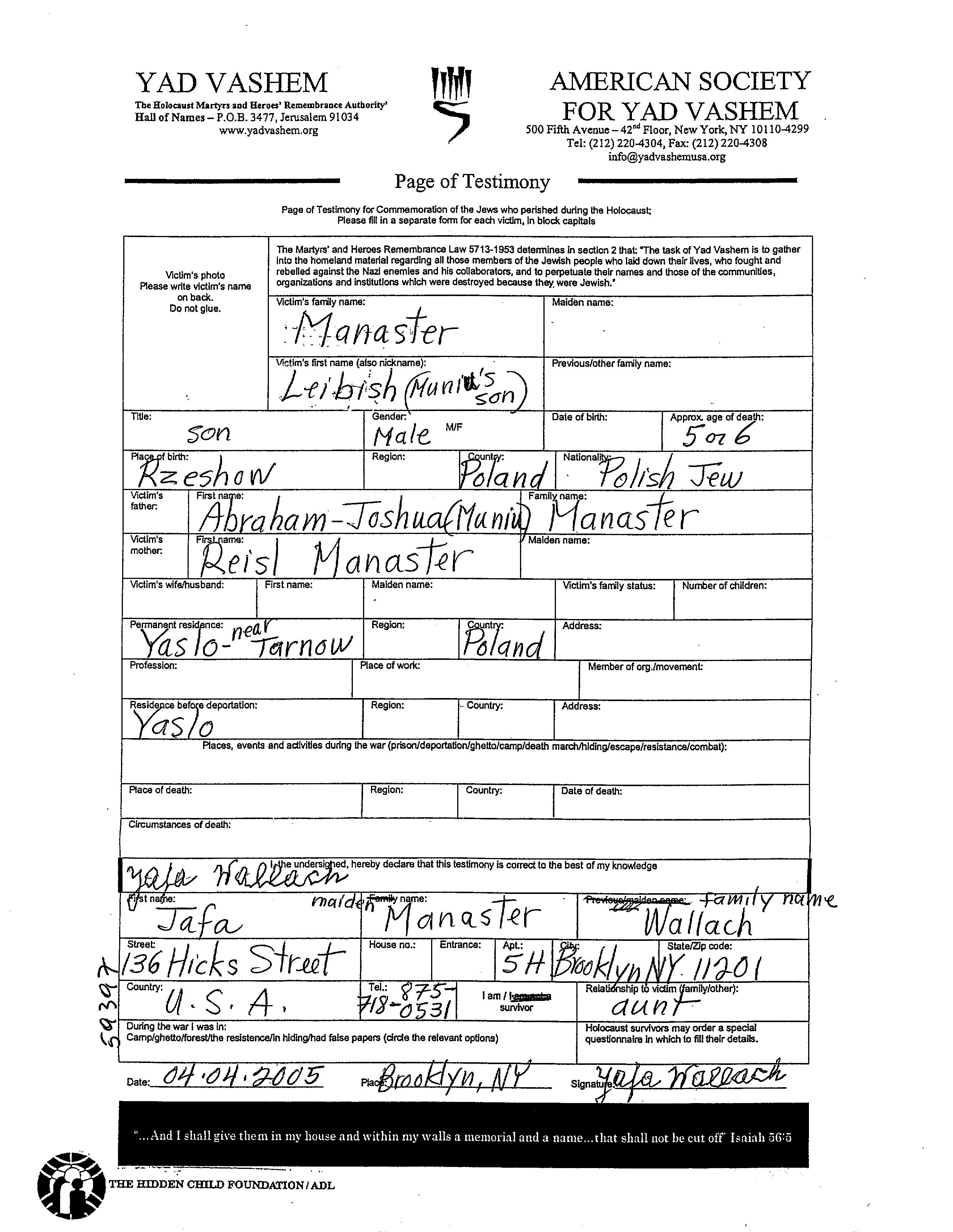 Manaster Leibish Jaslo, Pologne Feuille de témoignage