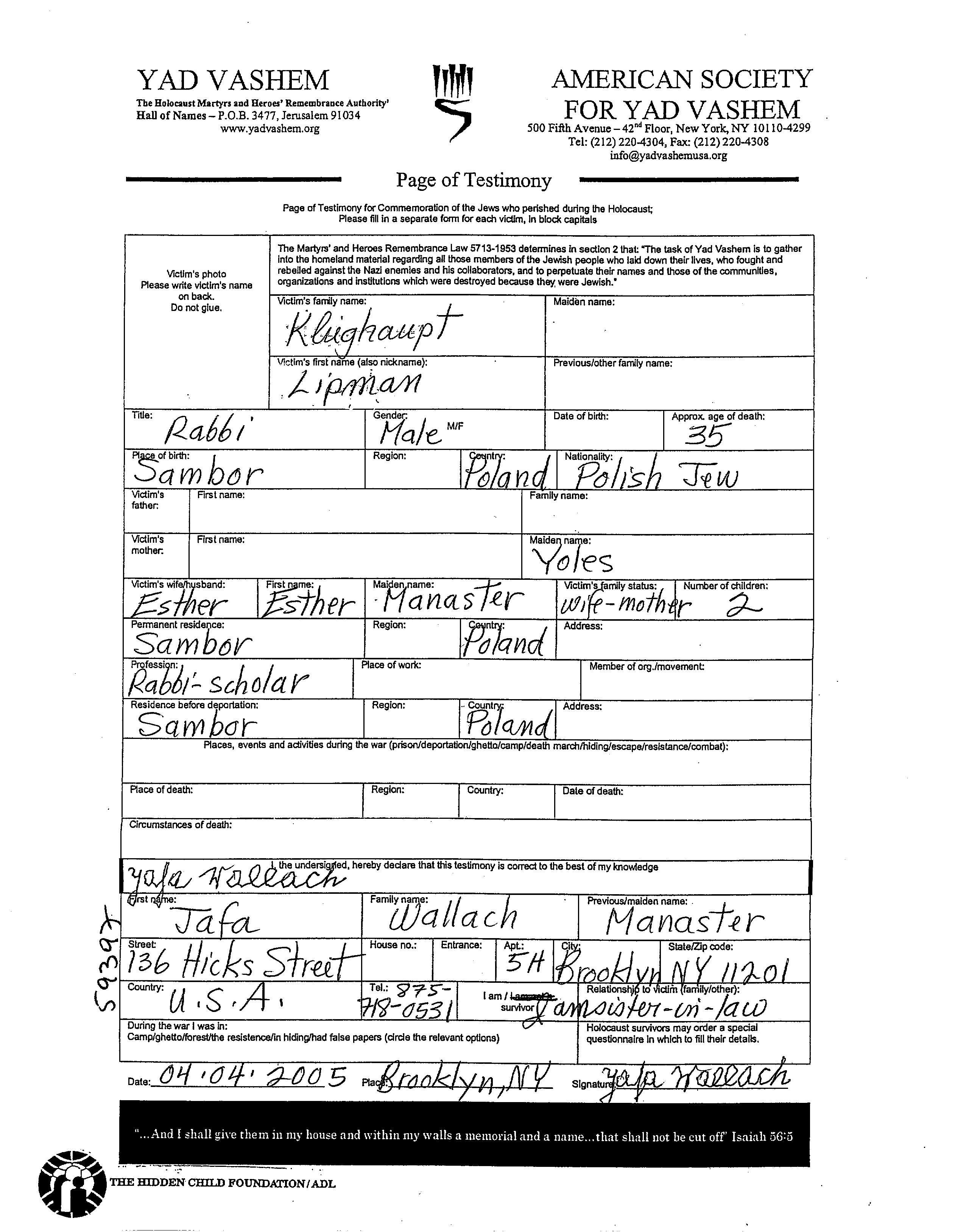 Klughaupt Lipman Sambor, Pologne Feuille de témoignage
