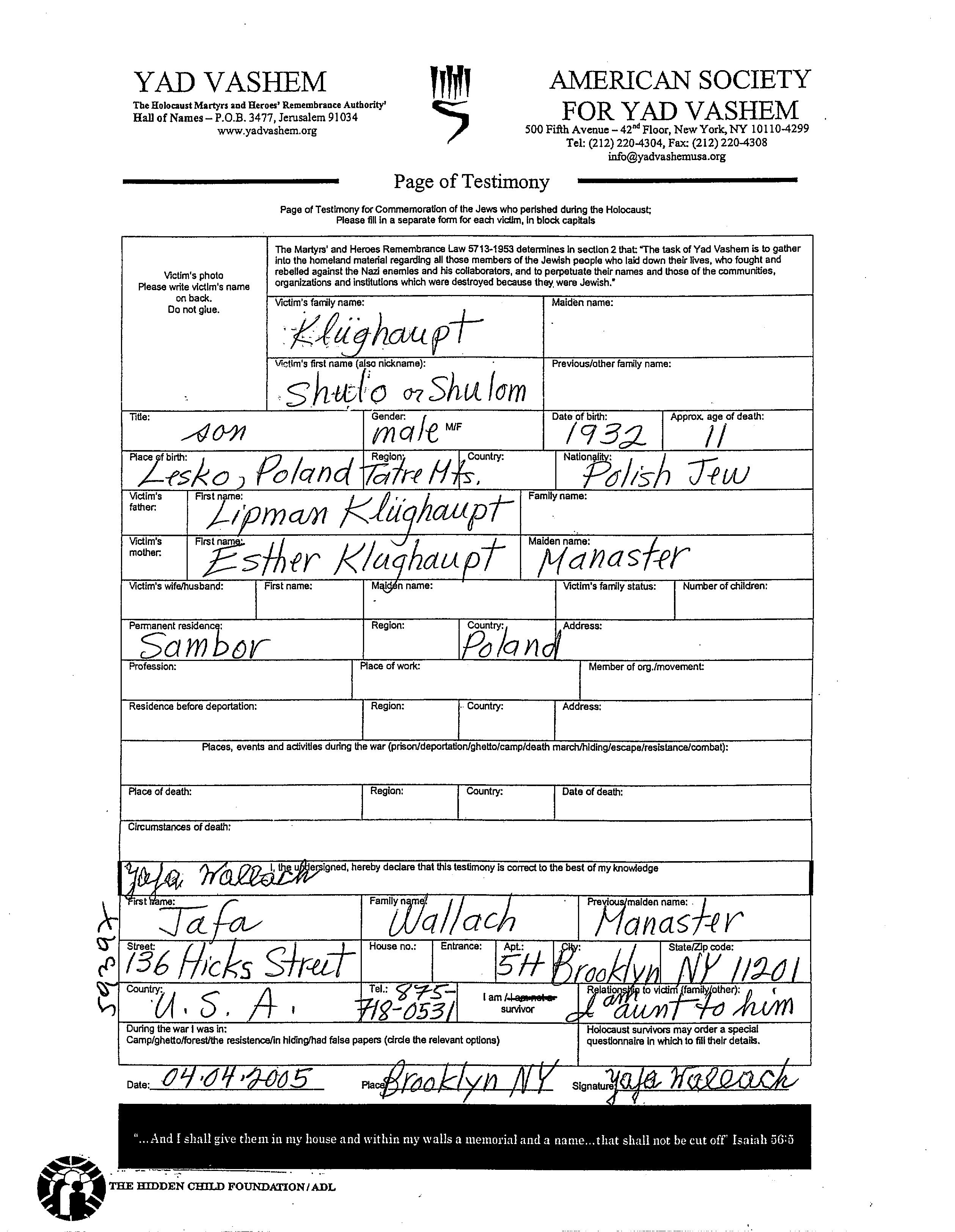 Klughaupt Shulom 1932 Sambor, Pologne Feuille de témoignage