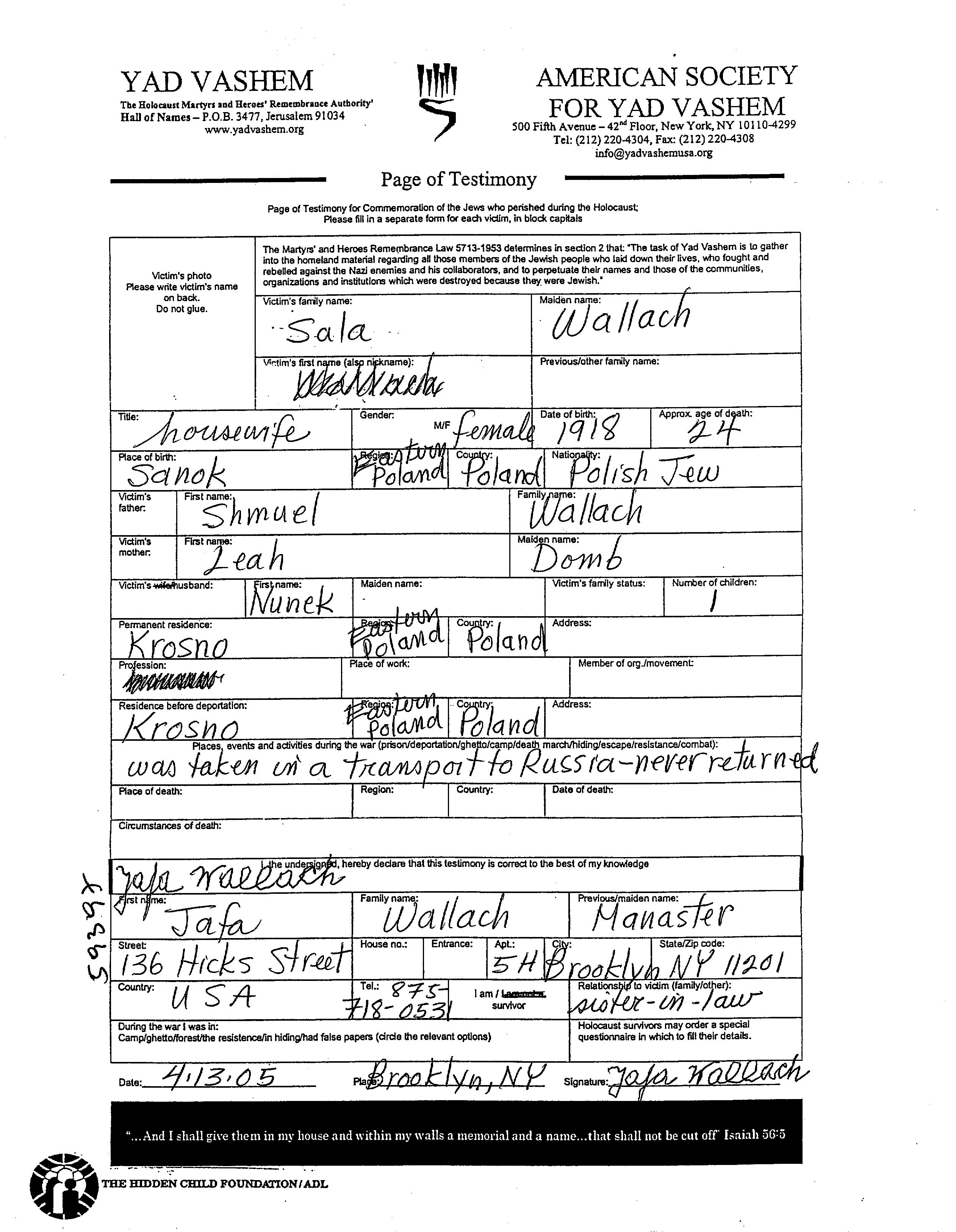 Sala nom inconnu née Wallach est née à Sanok, Pologne en 1918, fille de Shmuel et de Leah née Domb. Elle était Femme au foyer et Mariée à Nunek. Avant la seconde guerre mondiale elle vivait à Krosno, Pologne. Pendant la guerre, elle était à Krosno, Pologne.