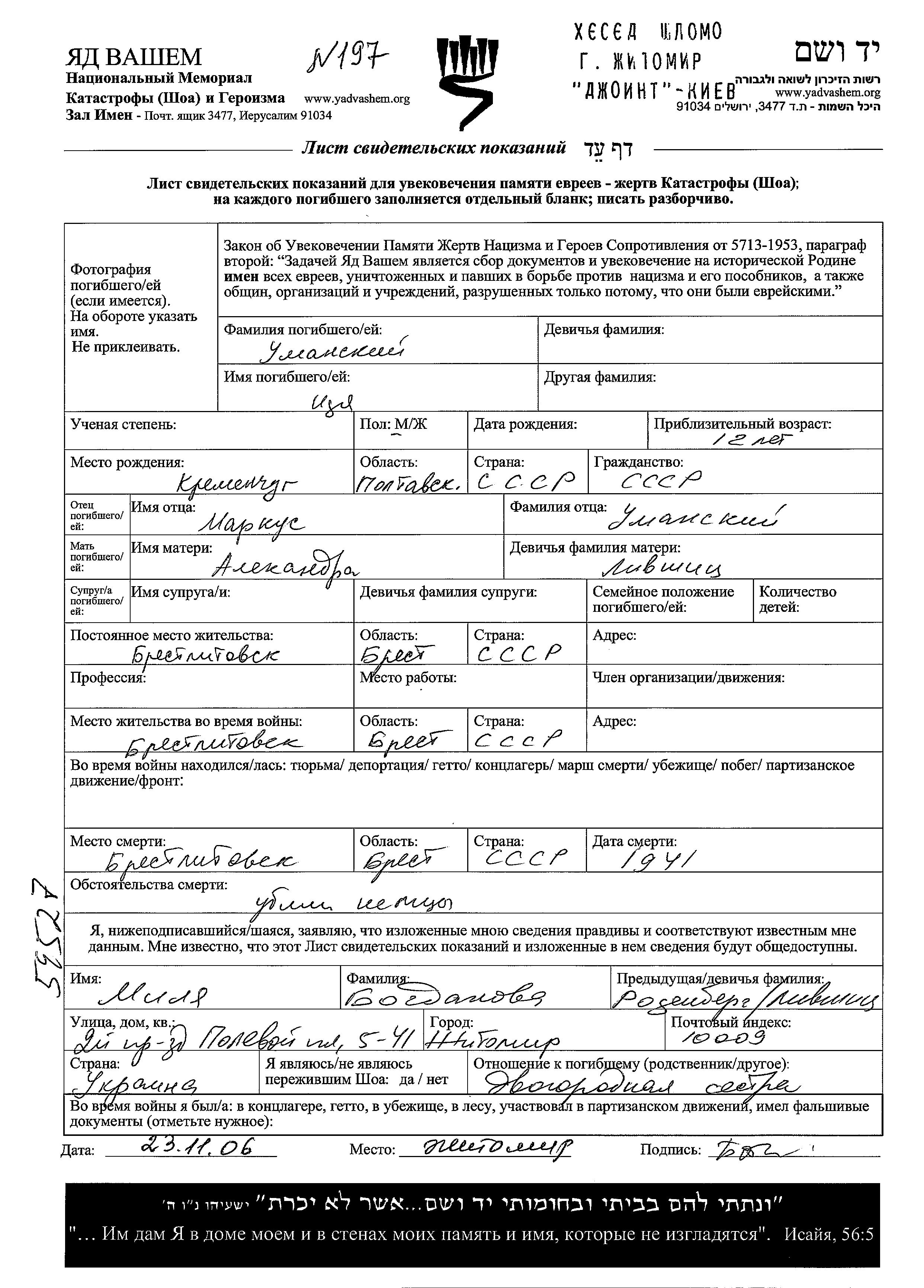 Umanski Izya Brest Litovsk, Pologne Feuille de témoignage