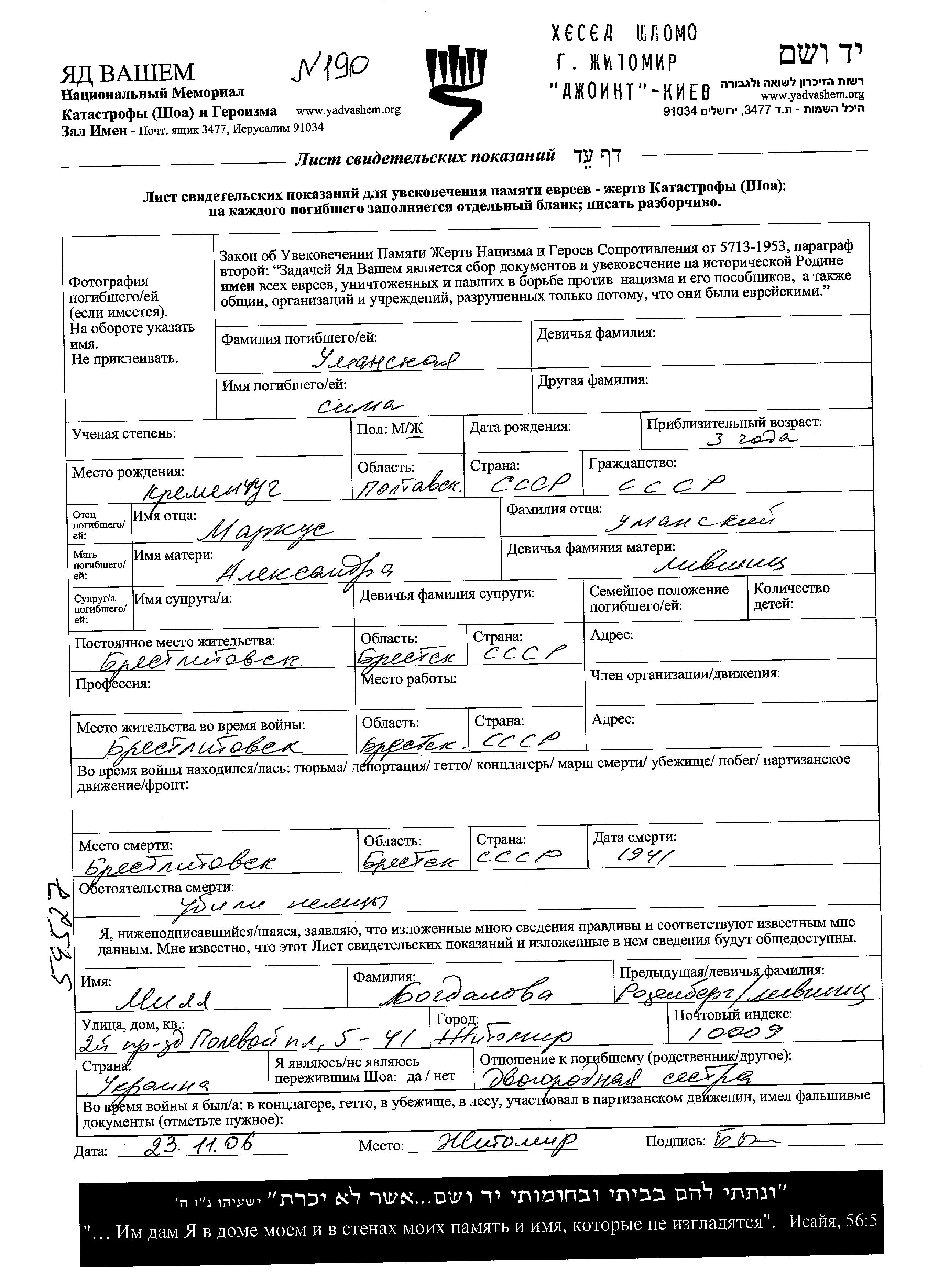 Umanskaya Sima Brest Litovsk, Pologne Feuille de témoignage