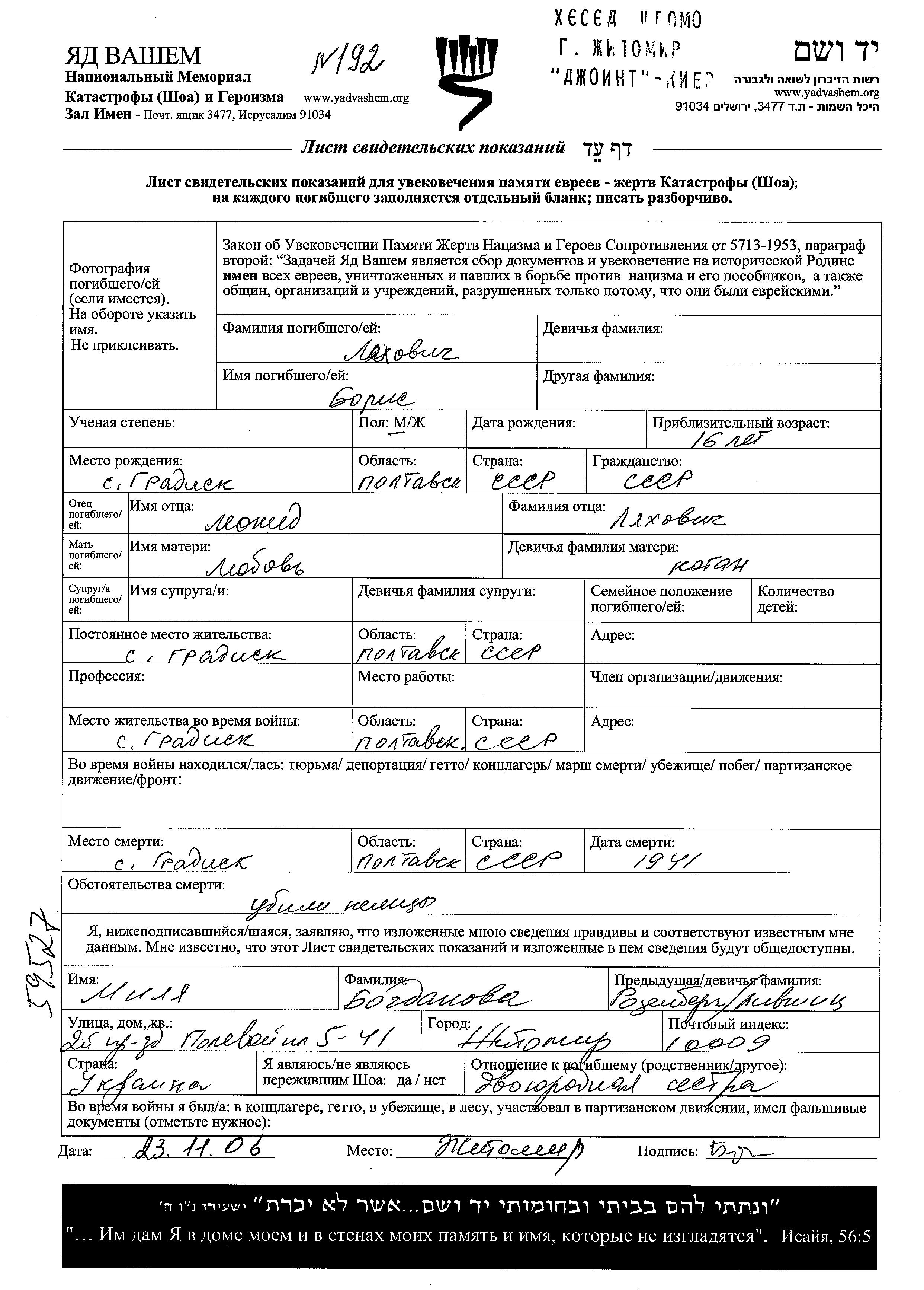 Boris a été assassiné pendant la Shoah. Lieu de la mort: Gradizhsk, Ukraine (URSS) en 1941.