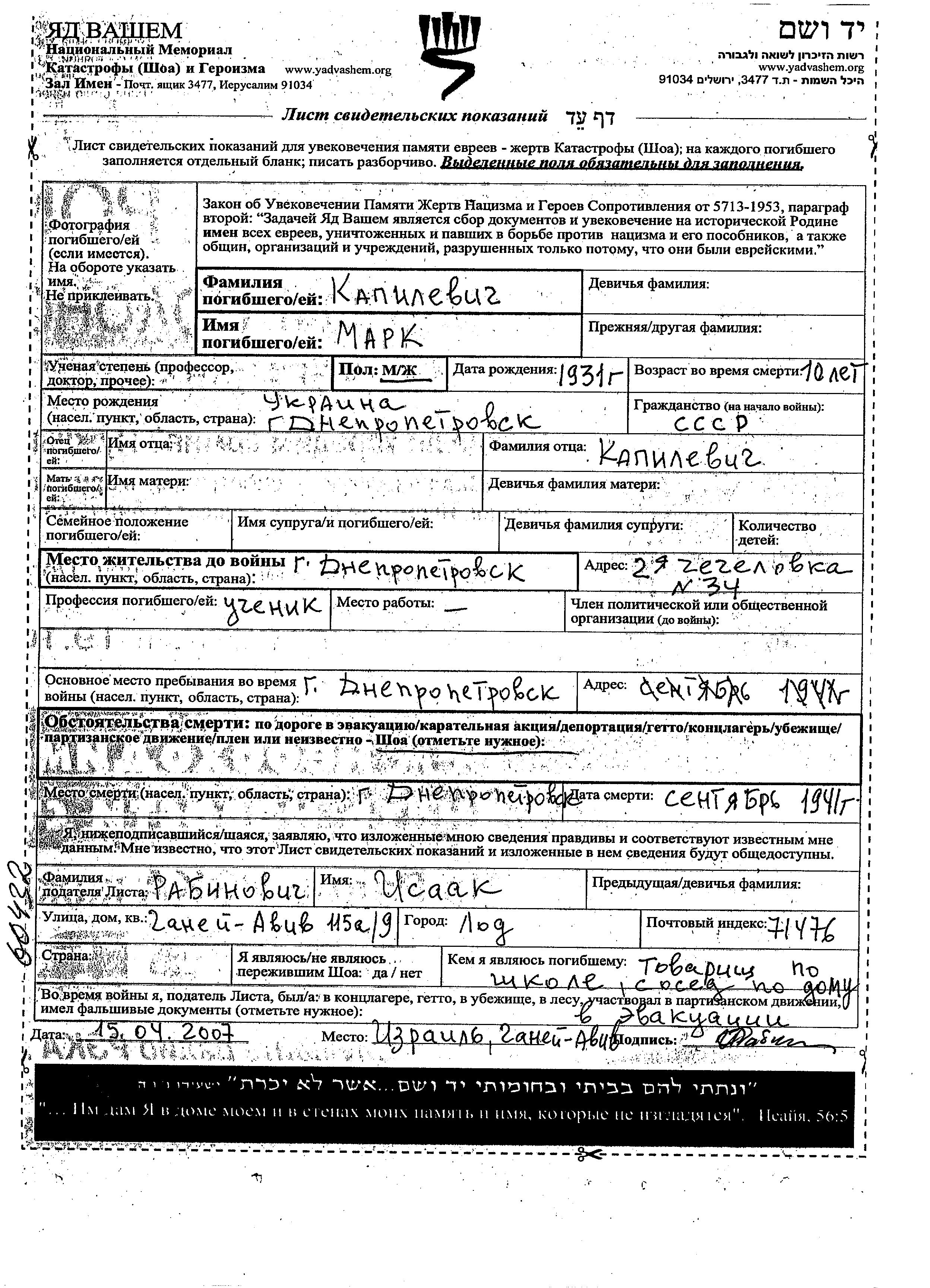Kapilevich Mark 1931 Dnepropetrovsk, Ukraine (URSS) Feuille de témoignage