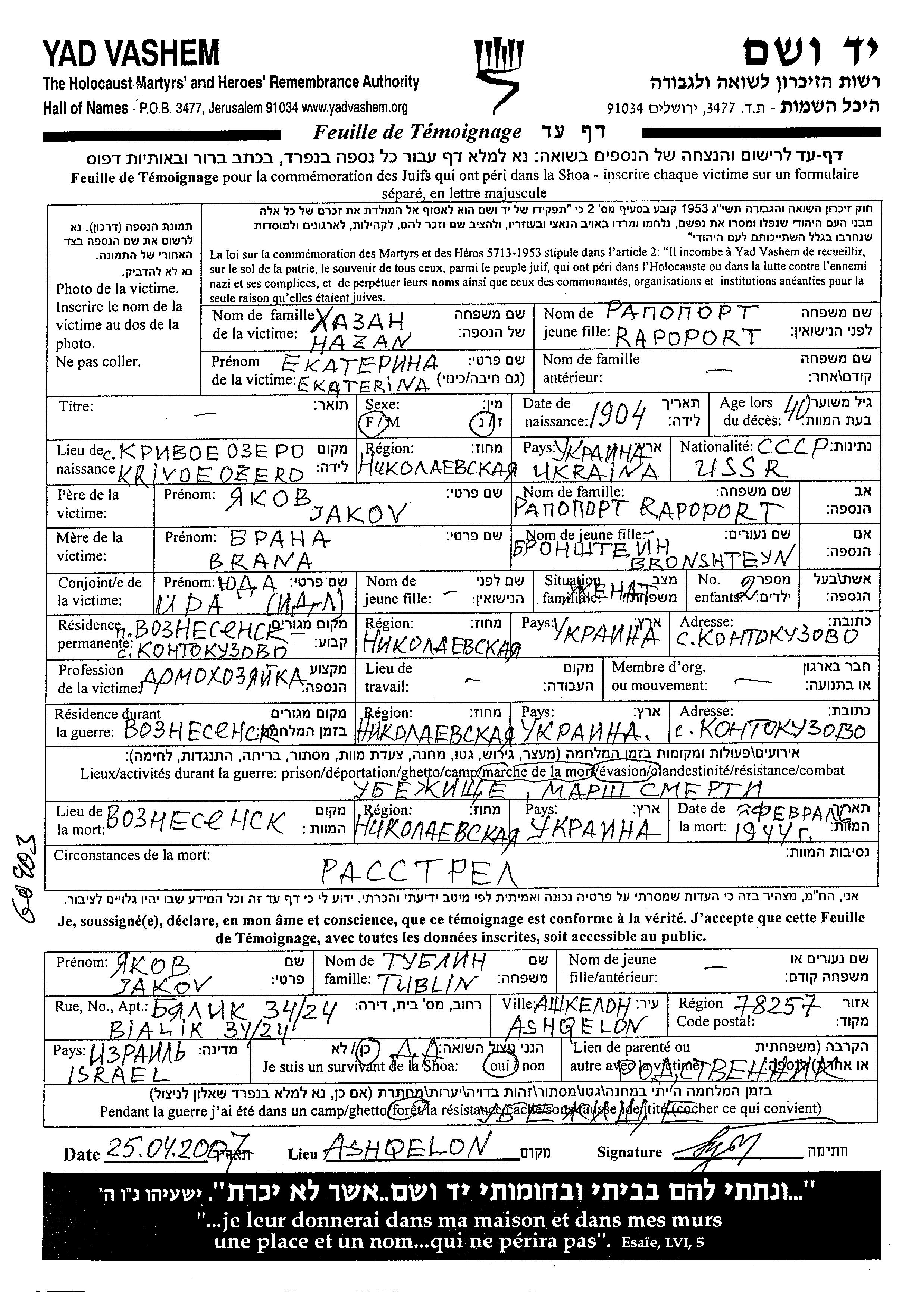 Khazan Yekaterina 1904 Voznesensk, Ukraine (URSS) Feuille de témoignage