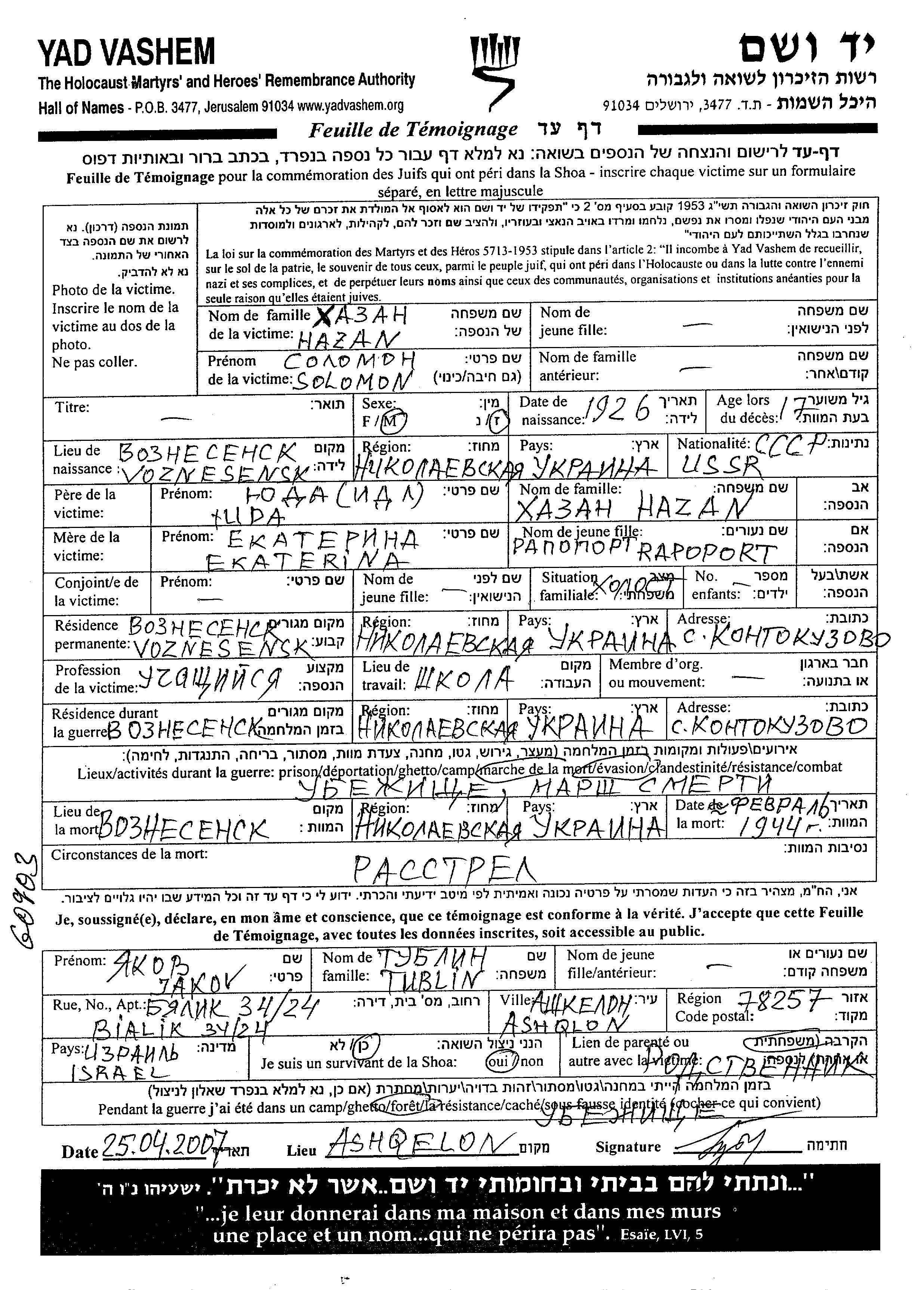 Khazan Solomon 1926 Voznesensk, Ukraine (URSS) Feuille de témoignage