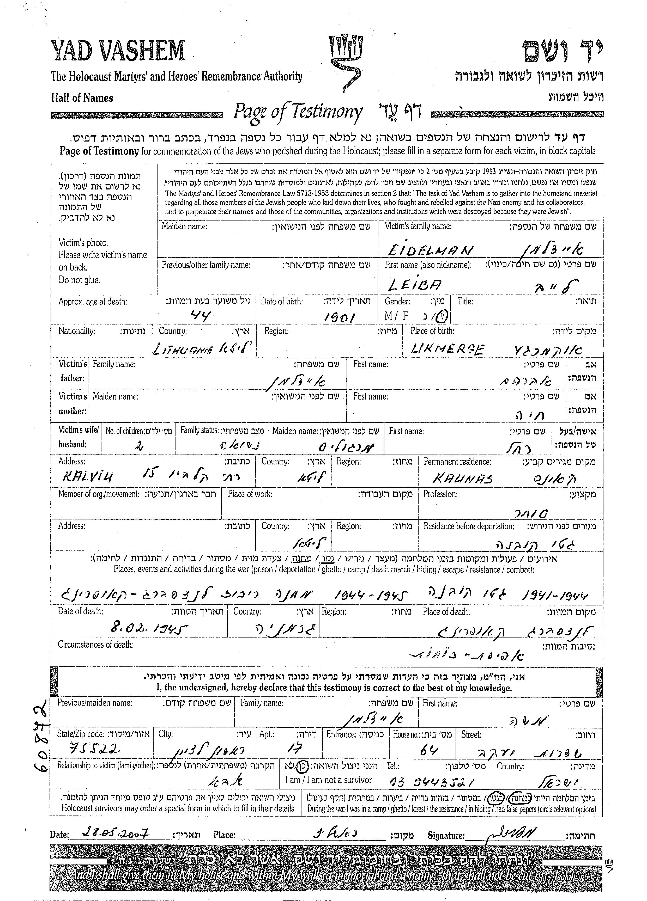 Eidelman Leiba Leib 1901 Kaunas, Lituanie Feuille de témoignage