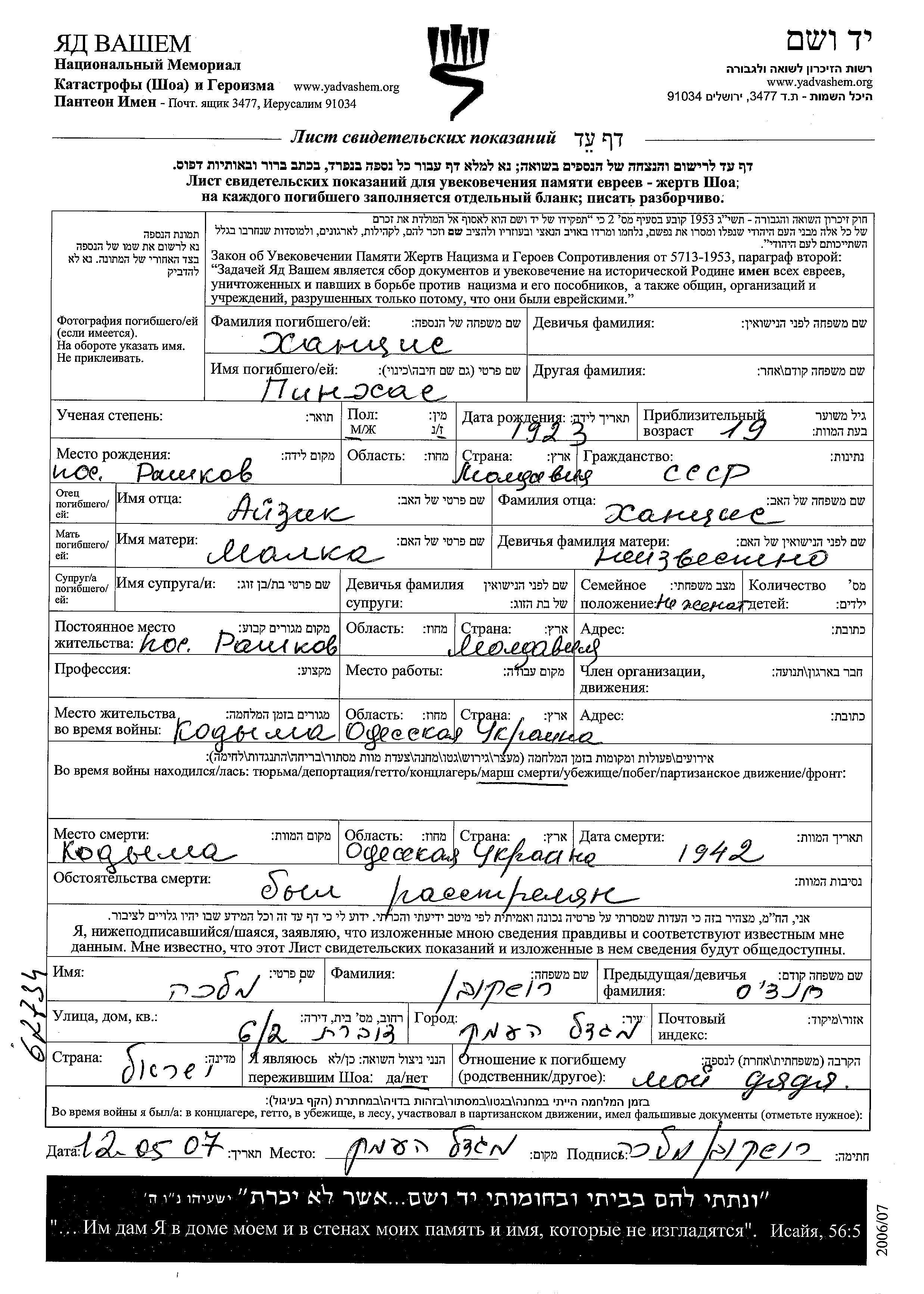 Khantzis Pinkhas 1923 Rashkov, Roumanie Feuille de témoignage