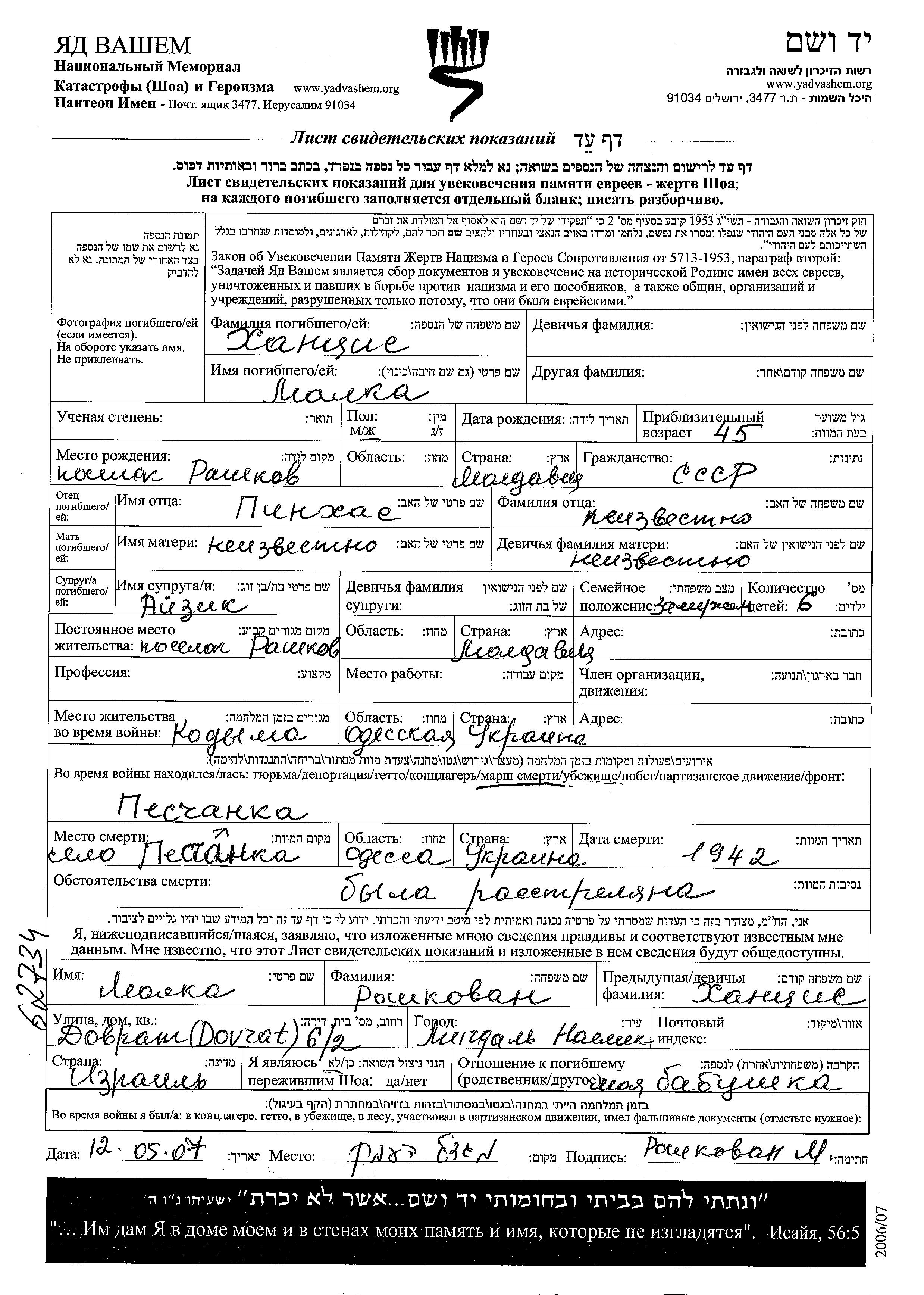 Khantzis Malka Rashkov, Ukraine (URSS) Feuille de témoignage