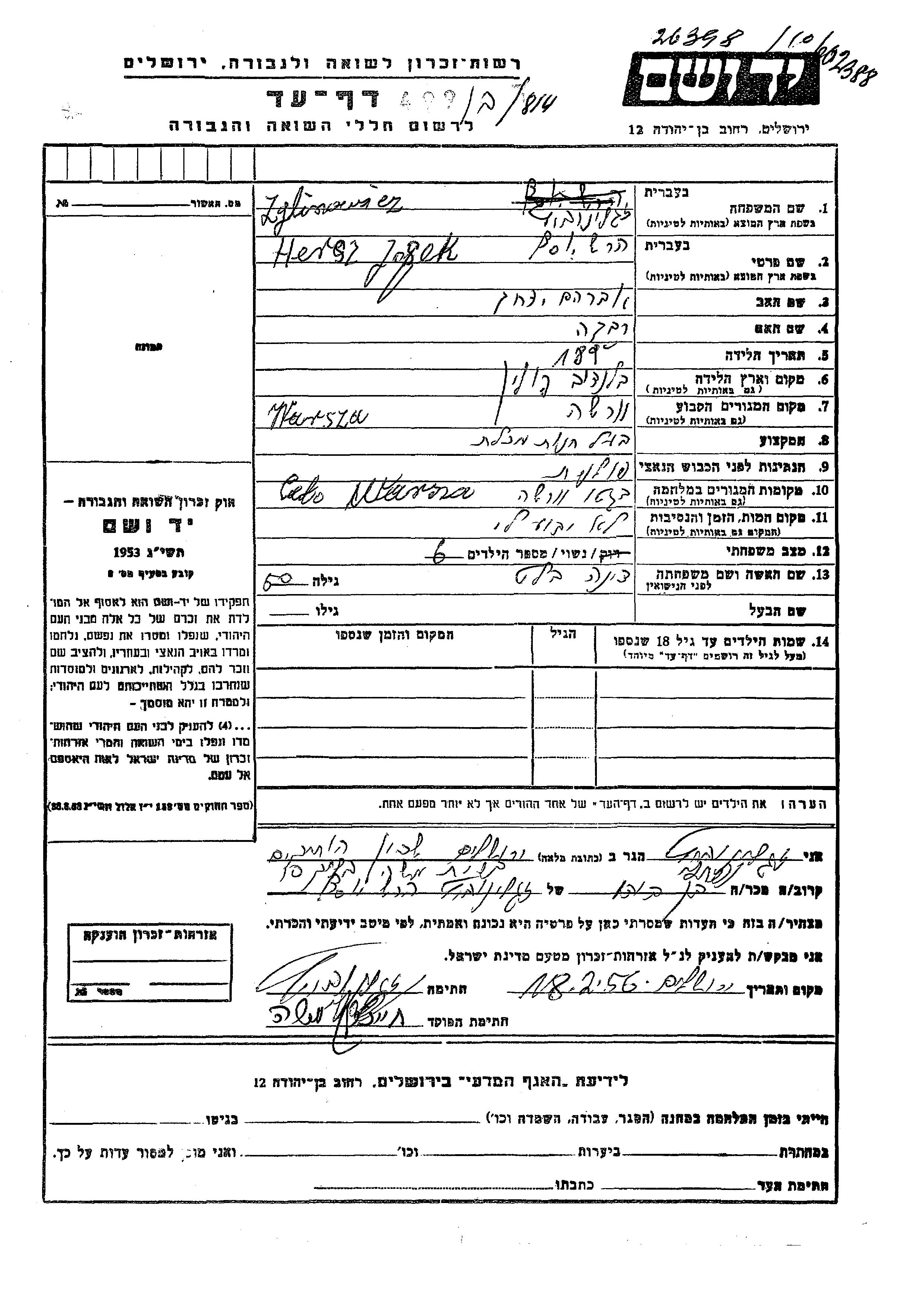 Zglinowicz Hersz Josek 1890 Varsha, Pologne Feuille de témoignage