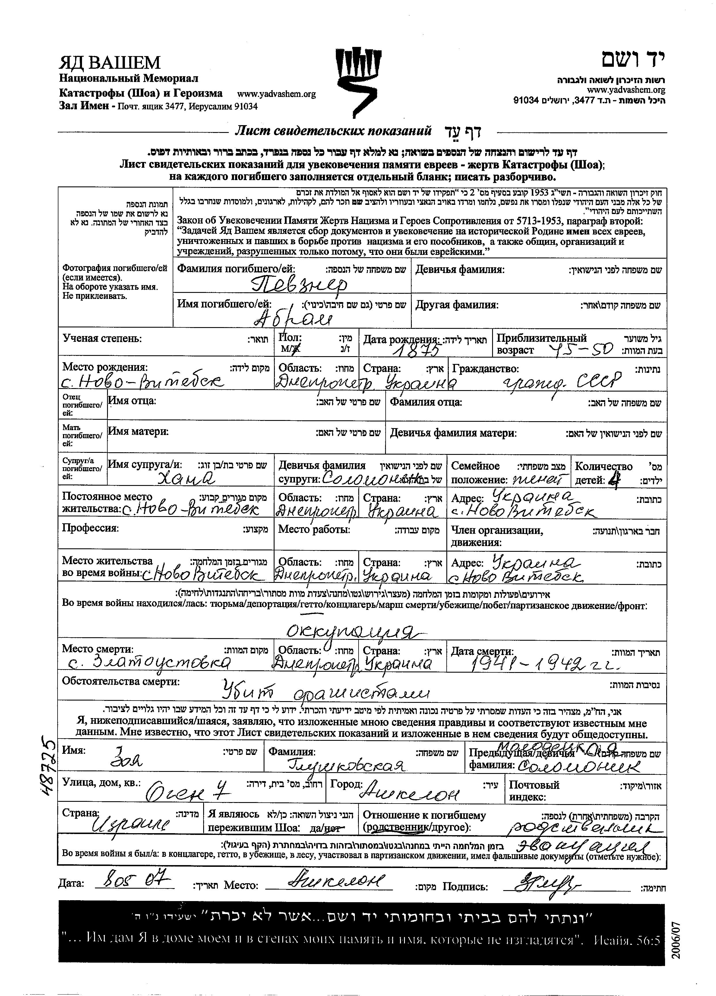 Pevzner Abram 1875 Novo Vitebsk, Ukraine (URSS) Feuille de témoignage