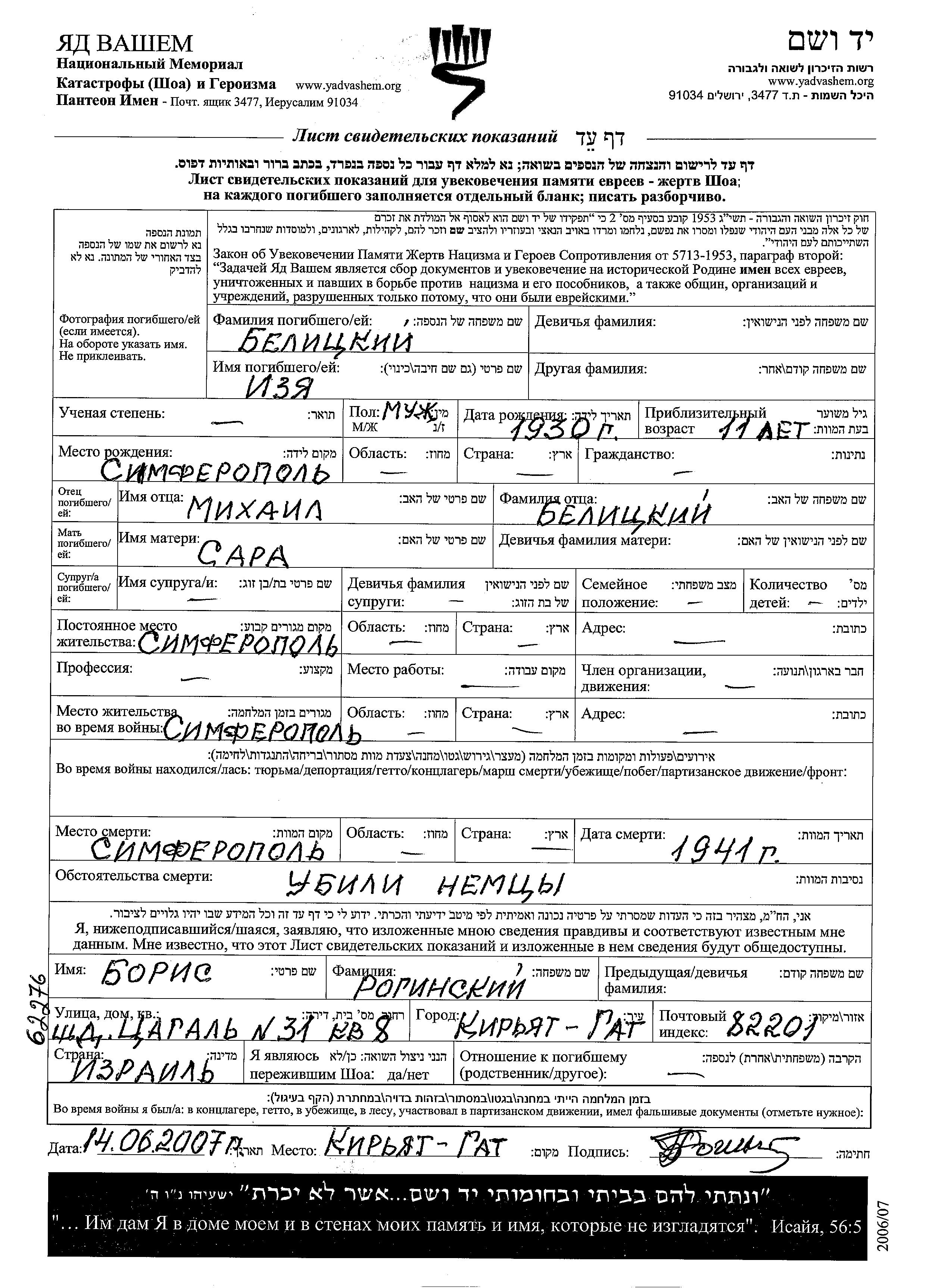 Yad Vashem - Pages of Testimony Names Memorial Collection