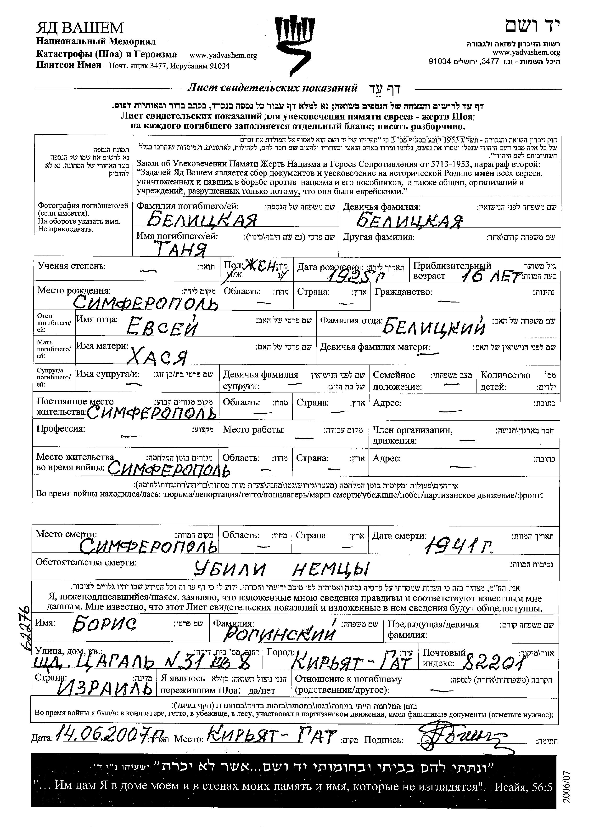 Belitzkaya Tanya 1925 Simferopol, Russie (URSS) Feuille de témoignage