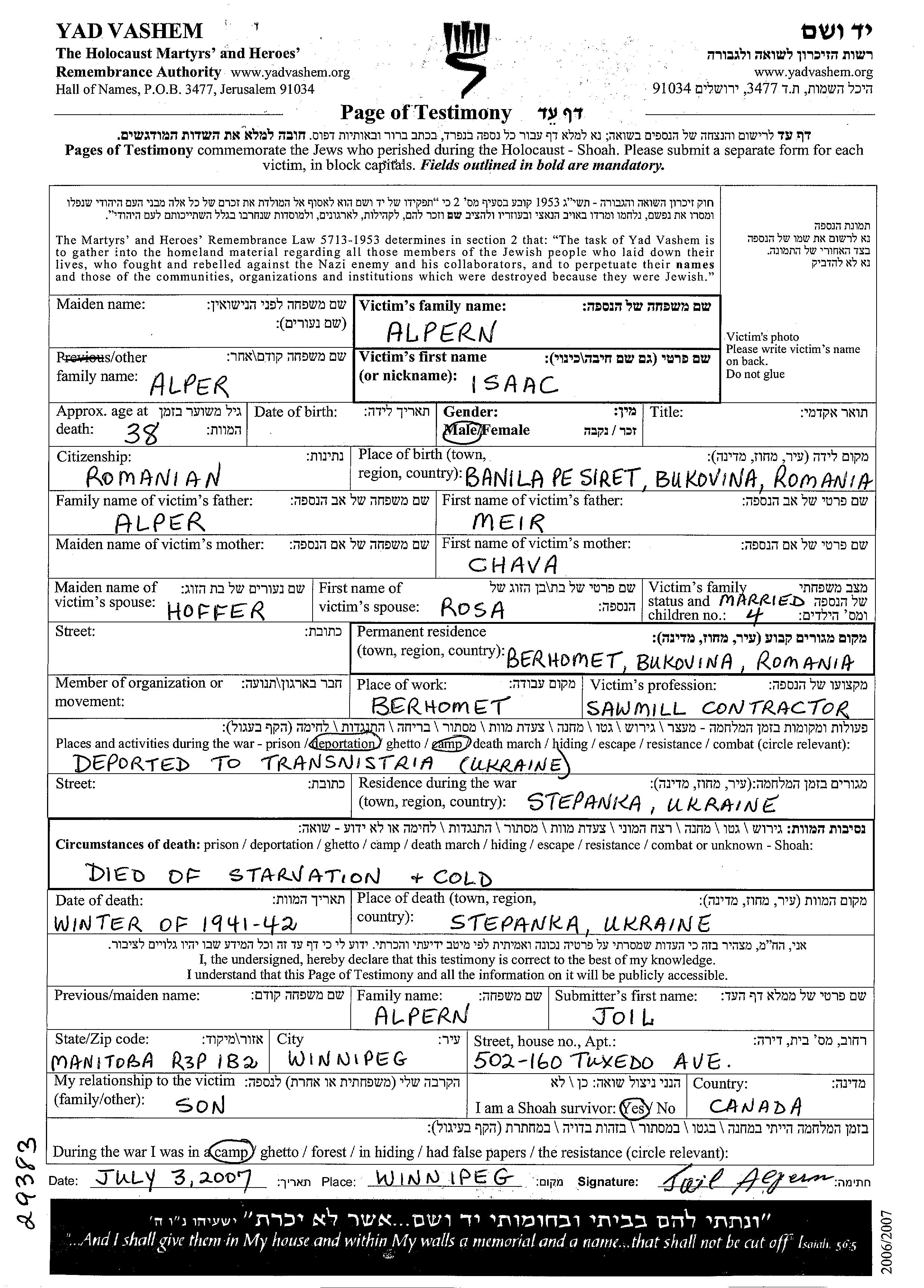 Isaac Alper Alpern est né à Banila pe Siret, Roumanie, fils de Meir et de Chava. Il était Scierie et Mariée à Rosa née Hoffer. Avant la seconde guerre mondiale il vivait à Berhomet, Roumanie. Au cours de la guerre, il était à Stepanki, Ukraine (URSS).