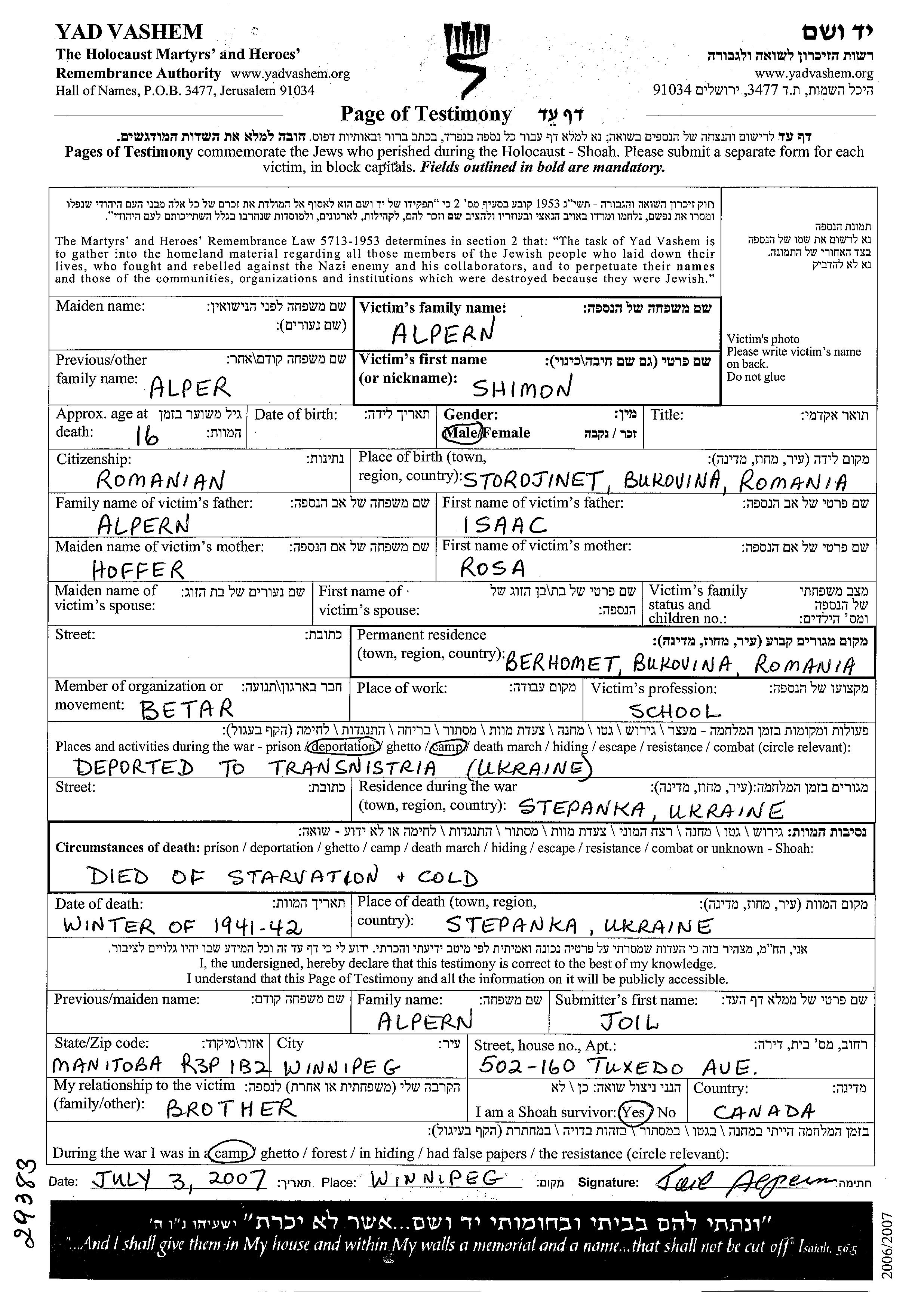 Shimon Alpern Alper est né à Storojinet, Roumanie, fils de Isaac et de Rosa née Hoffer. Il était Élève. Avant la seconde guerre mondiale il vivait à Berhomet, Roumanie. Au cours de la guerre, il était à Stepanki, Ukraine (URSS).