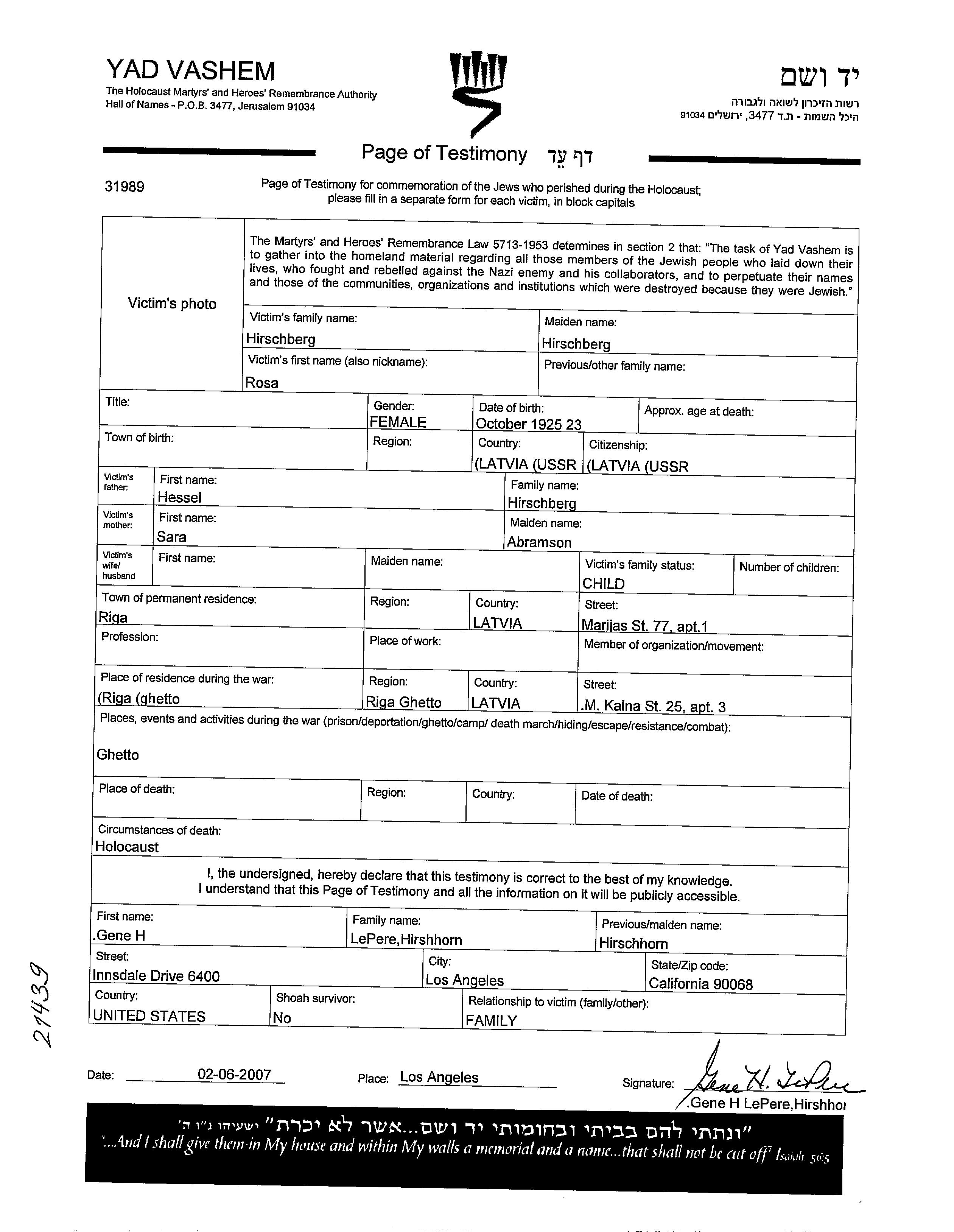 Rosa Hirschberg est née à Lettonie en 1925, fille de Hessel et de Sara née Abramson. Elle était Adolescent. Avant la seconde guerre mondiale elle vivait à Riga, Lettonie. Pendant la guerre, elle était à Riga, Lettonie.