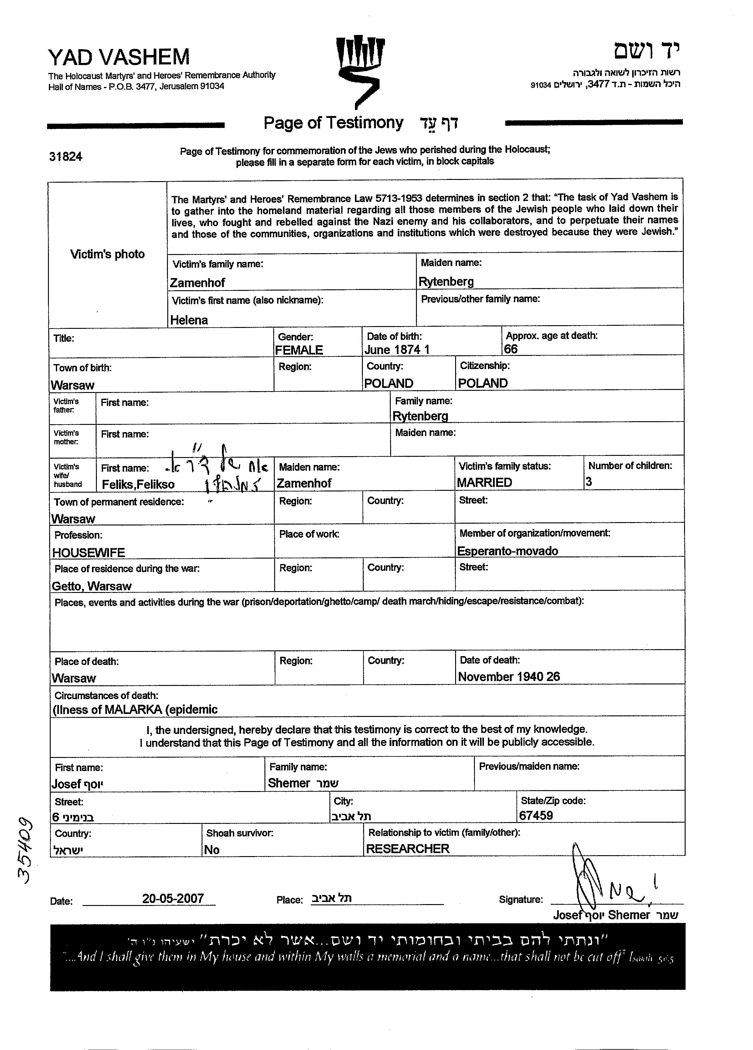 Helena Zamenhof née Rytenberg est née à Warszawa, Pologne en 1874. Elle était Femme au foyer et Mariée à Felikso née Zamenhof. Avant la seconde guerre mondiale elle vivait à Warszawa, Pologne. Pendant la guerre, elle était à Warszawa, Pologne.
