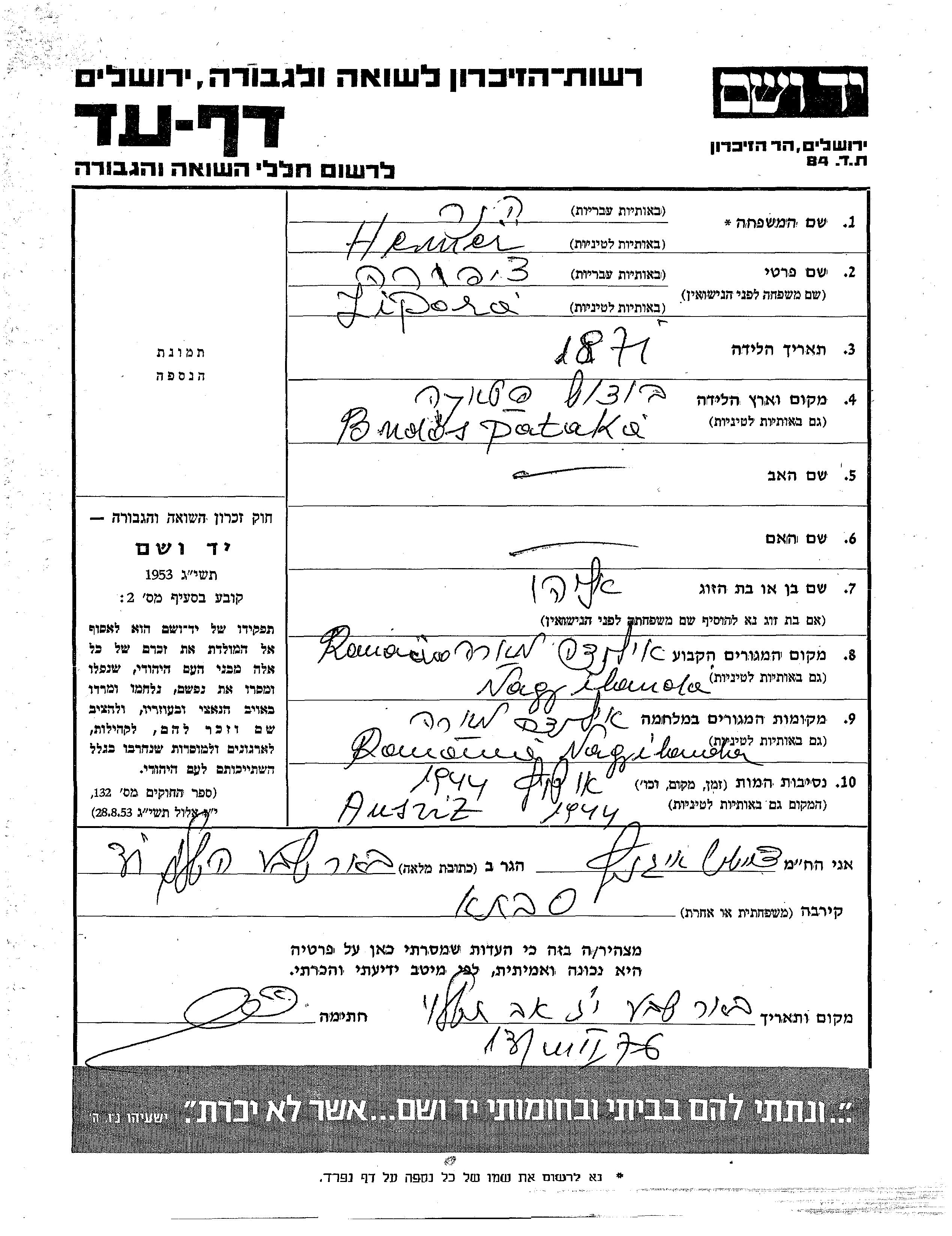 Yad Vashem - Pages of Testimony Names Memorial Collection