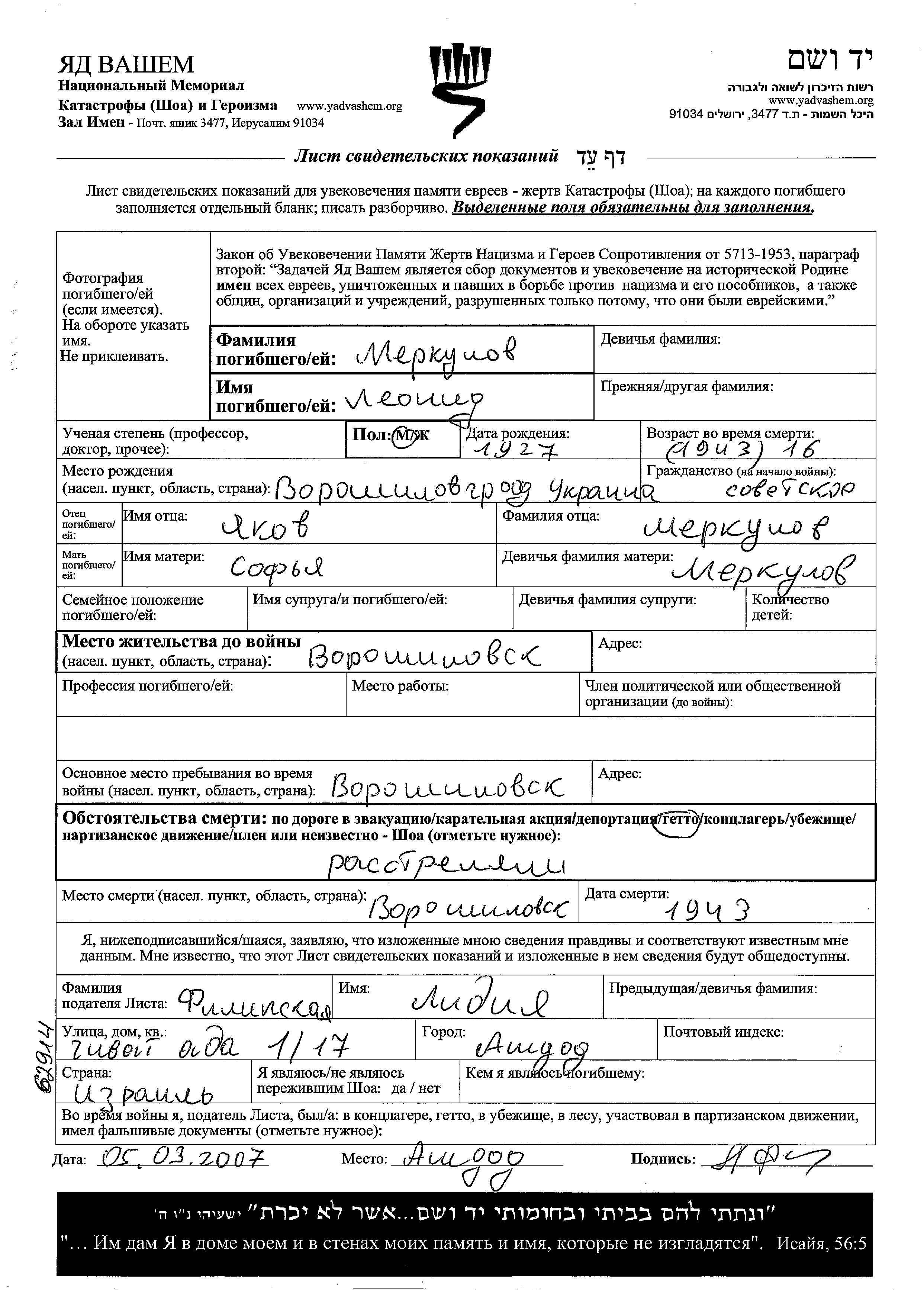 Merkulov Leonid 1927 Voroshilovsk, Ukraine (URSS) Feuille de témoignage
