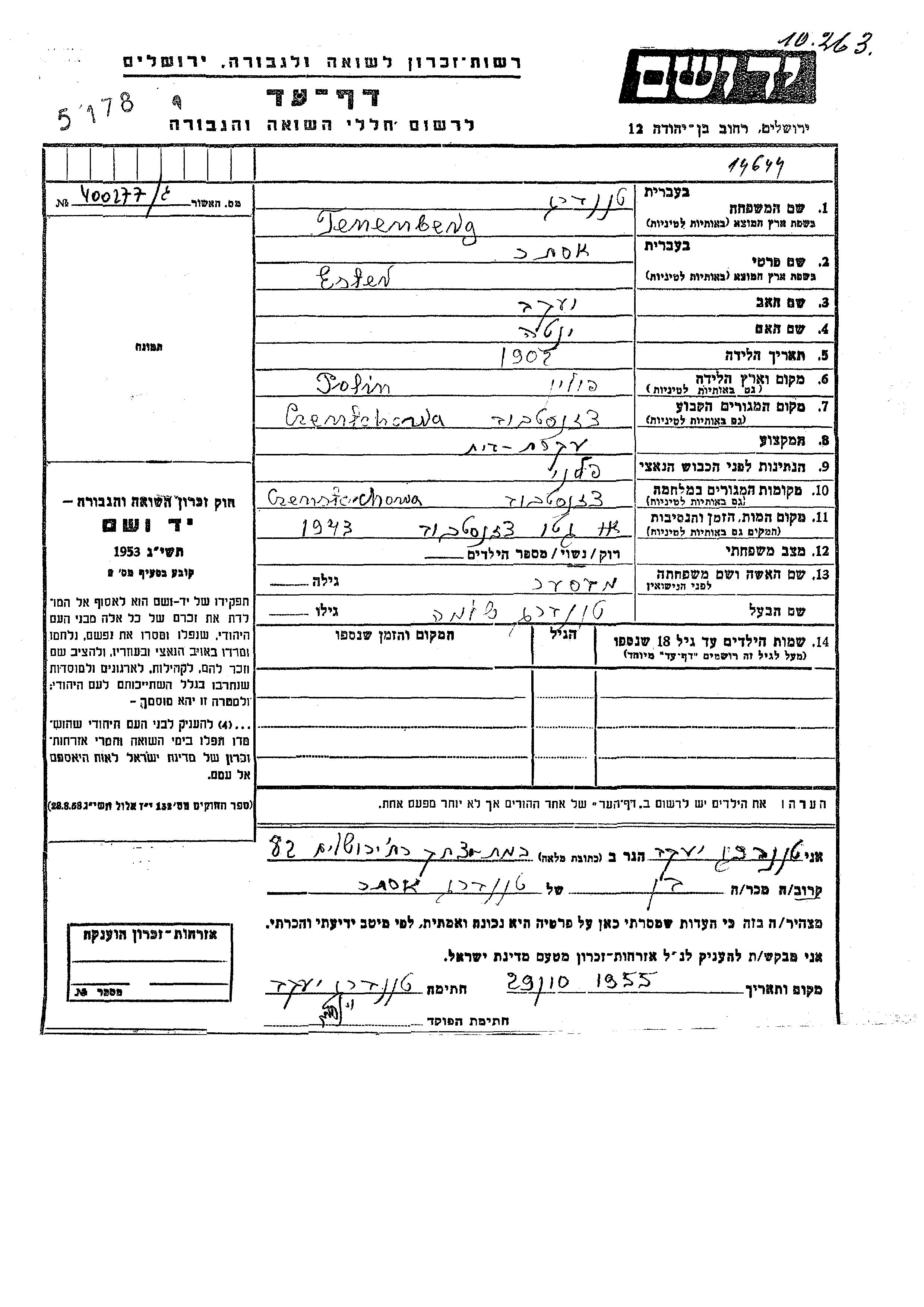 Tenenberg Ester 1902 Czenstchow, Pologne Feuille de témoignage