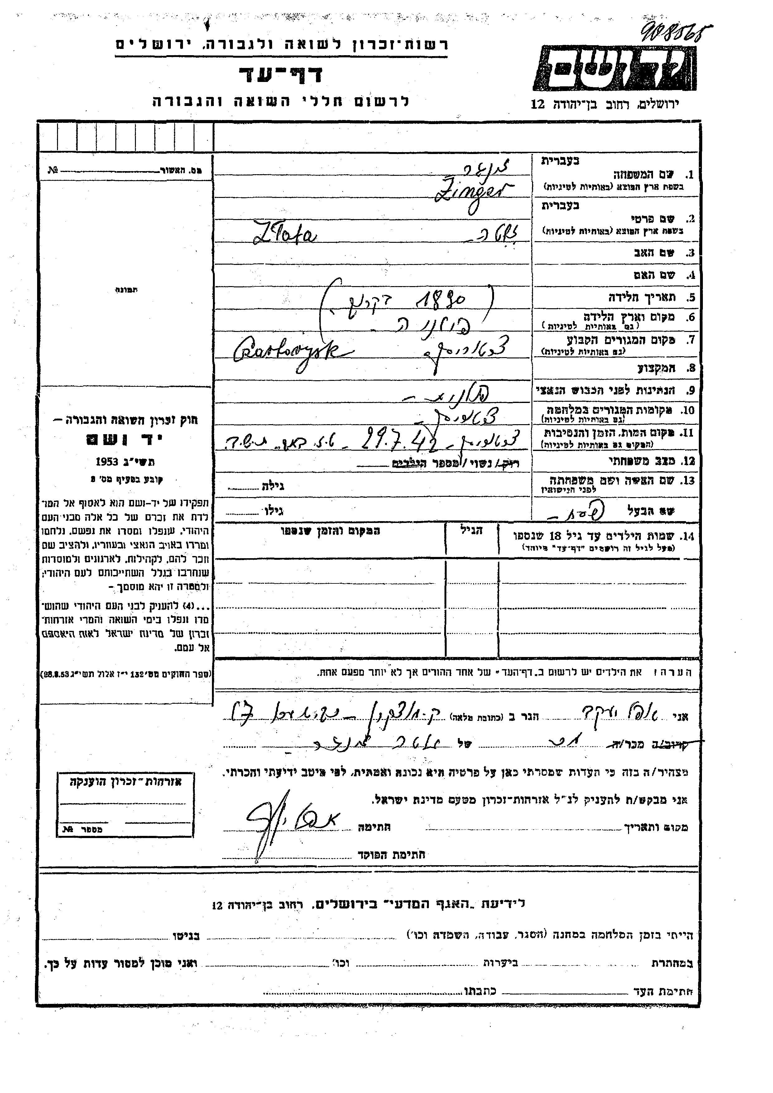 Zinger Zlata 1890 Czartorysk, Pologne Feuille de témoignage