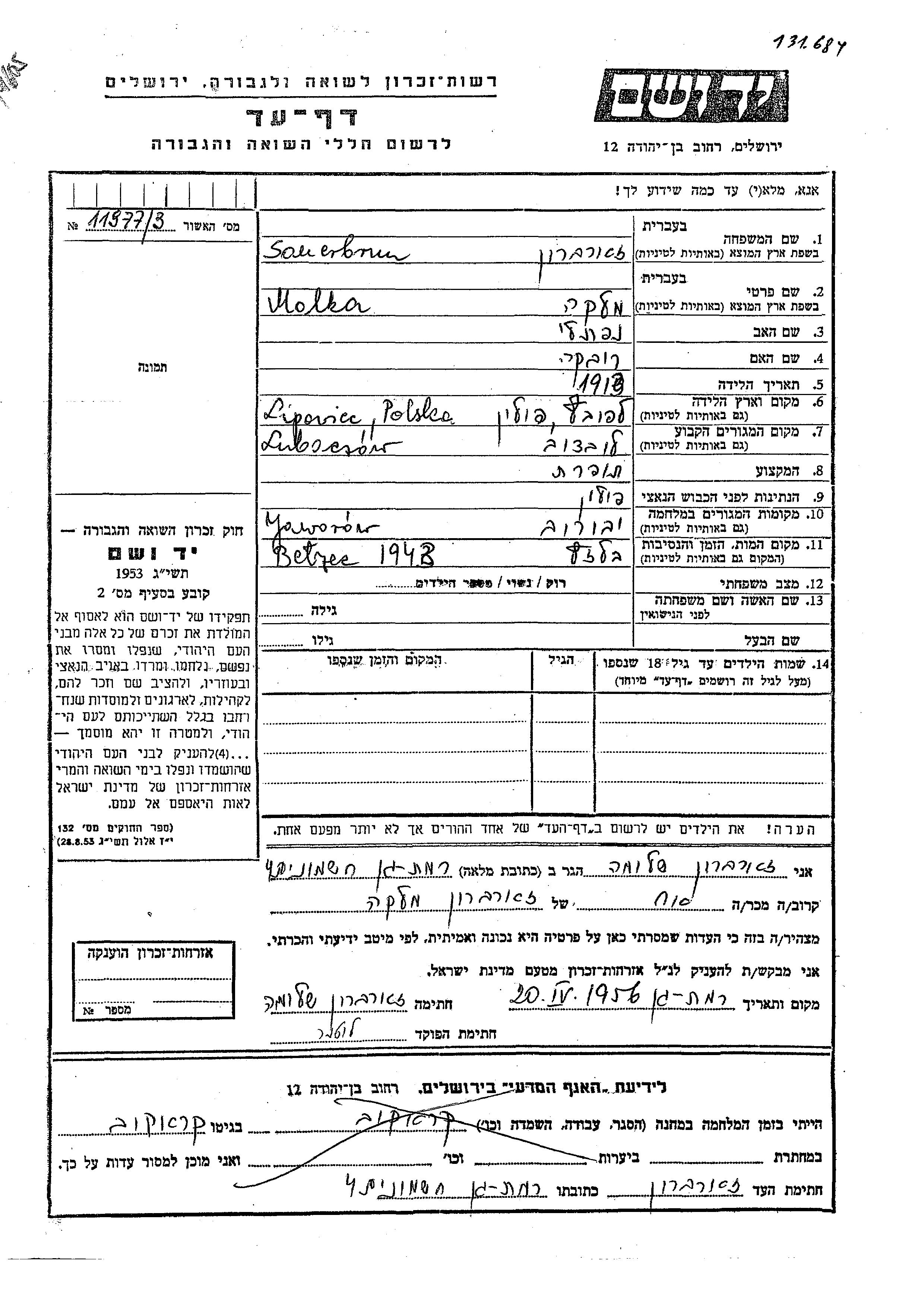 Malka Zauerbrun est née à Lipowce, Pologne en 1913, fille de Naftali et de Rivka. Elle était Couturière. Avant la seconde guerre mondiale elle vivait à Lubaczow, Pologne. Pendant la guerre, elle était à Jaworow, Pologne.
