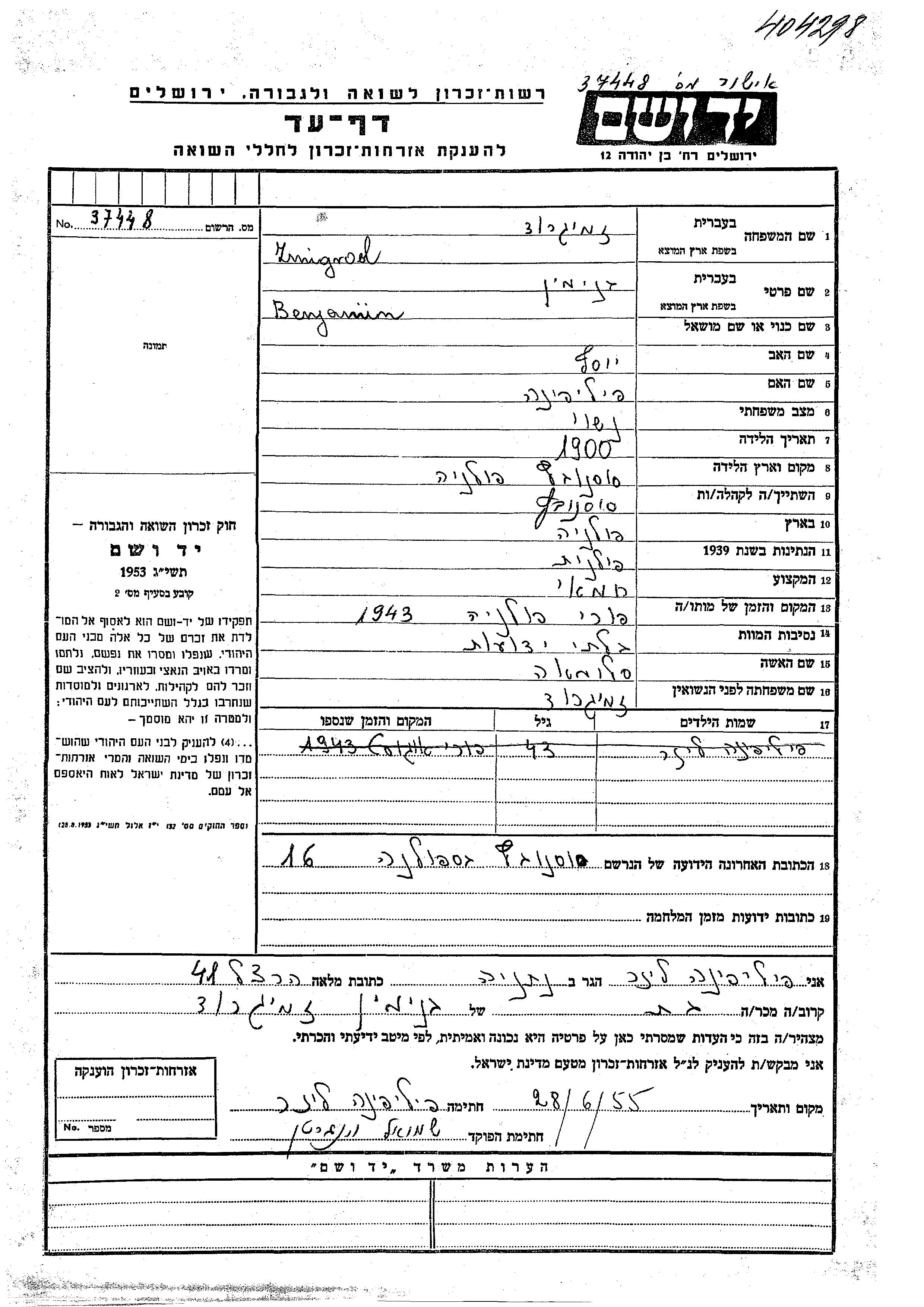 Benjamin a été assassiné pendant la Shoah. Lieu de la mort: Poraj, Pologne en 1943.
