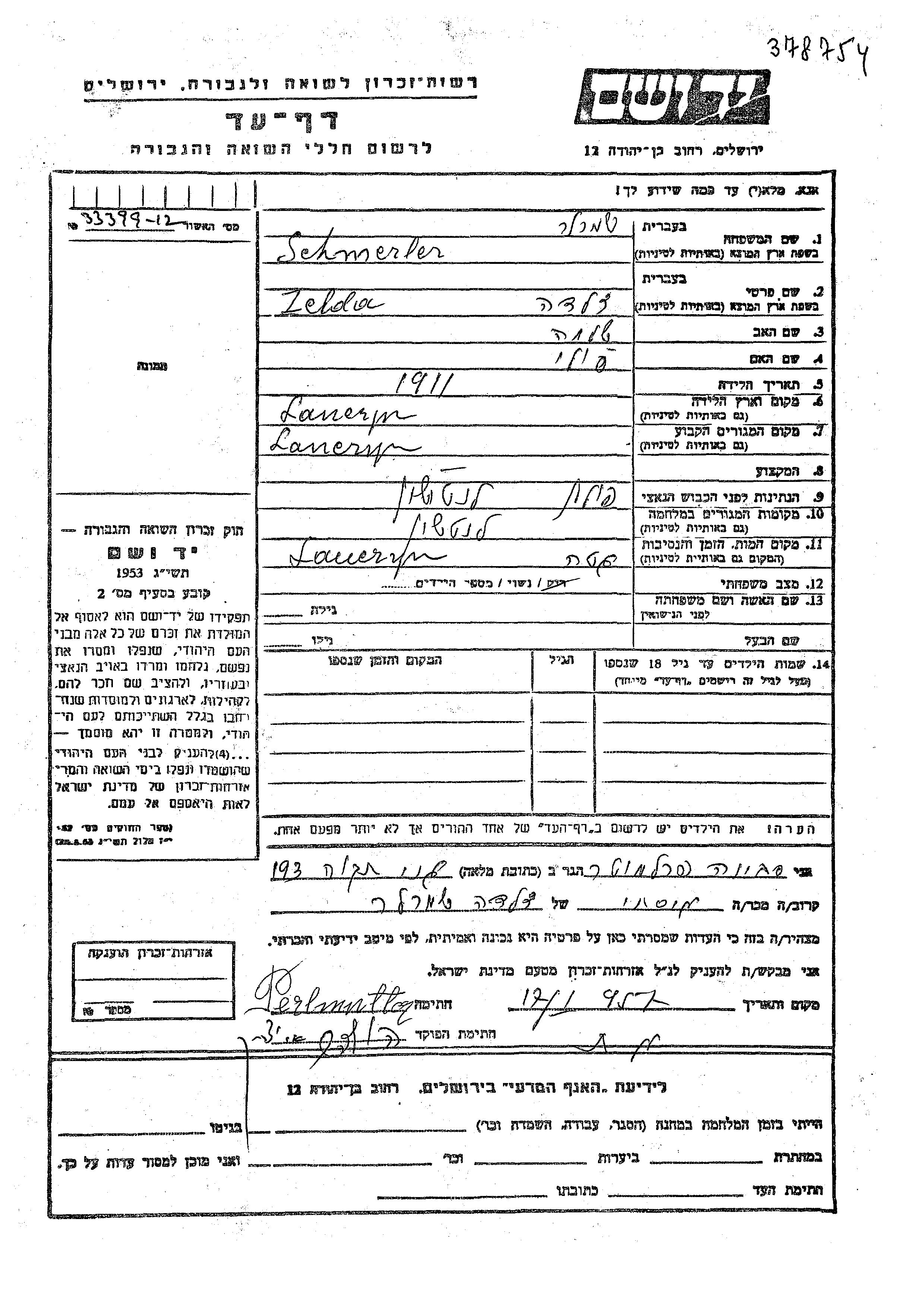 Schmerler Zelda 1911 Lanczyn, Pologne Feuille de témoignage