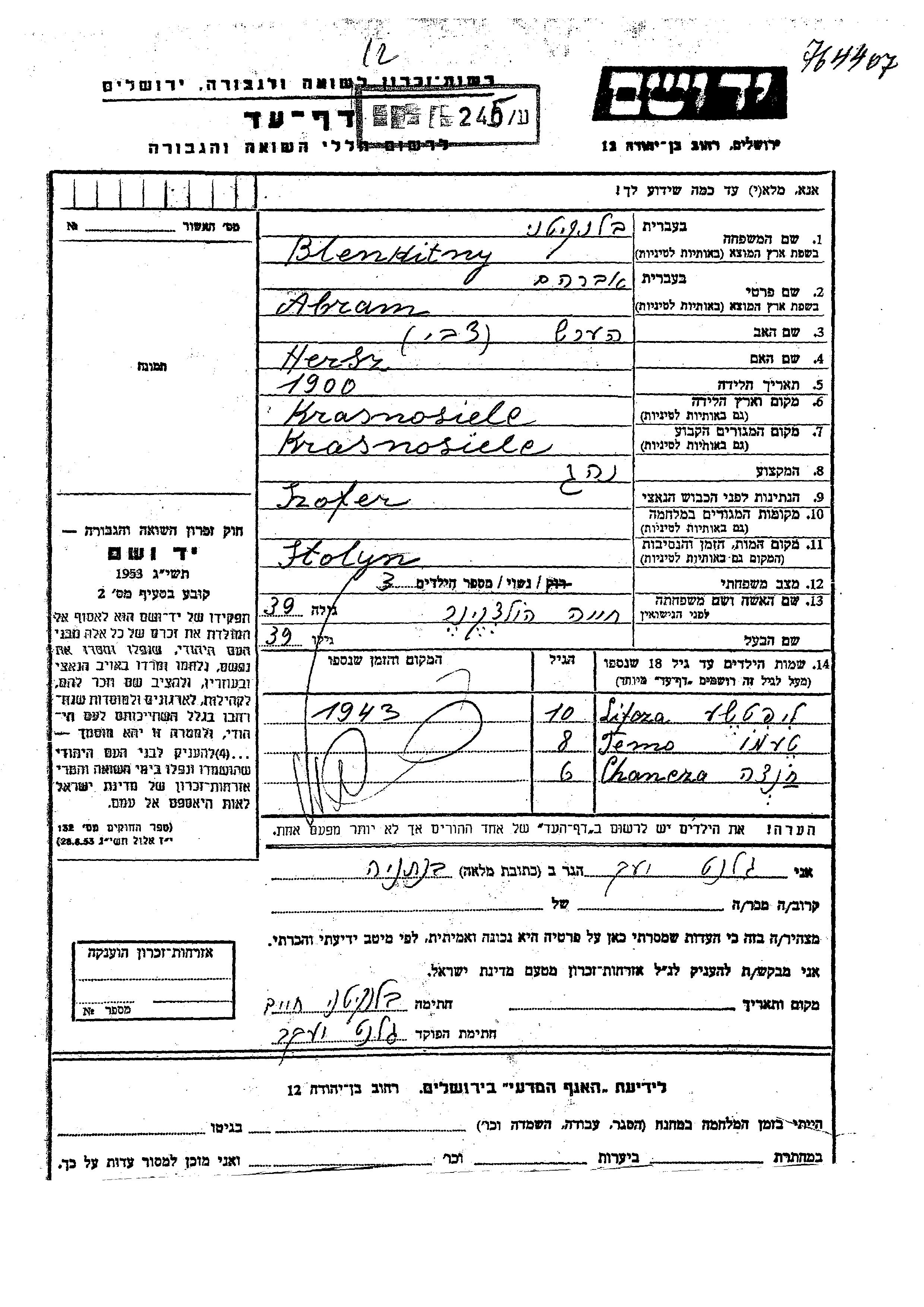 Abram Blenkitny est né à Krasnosielc, Pologne en 1900, fils de Hersz Tzvi. Il était Chauffeur et Mariée à Khaia née Holtzkiner. Avant la seconde guerre mondiale il vivait à Krasnosielc, Pologne.