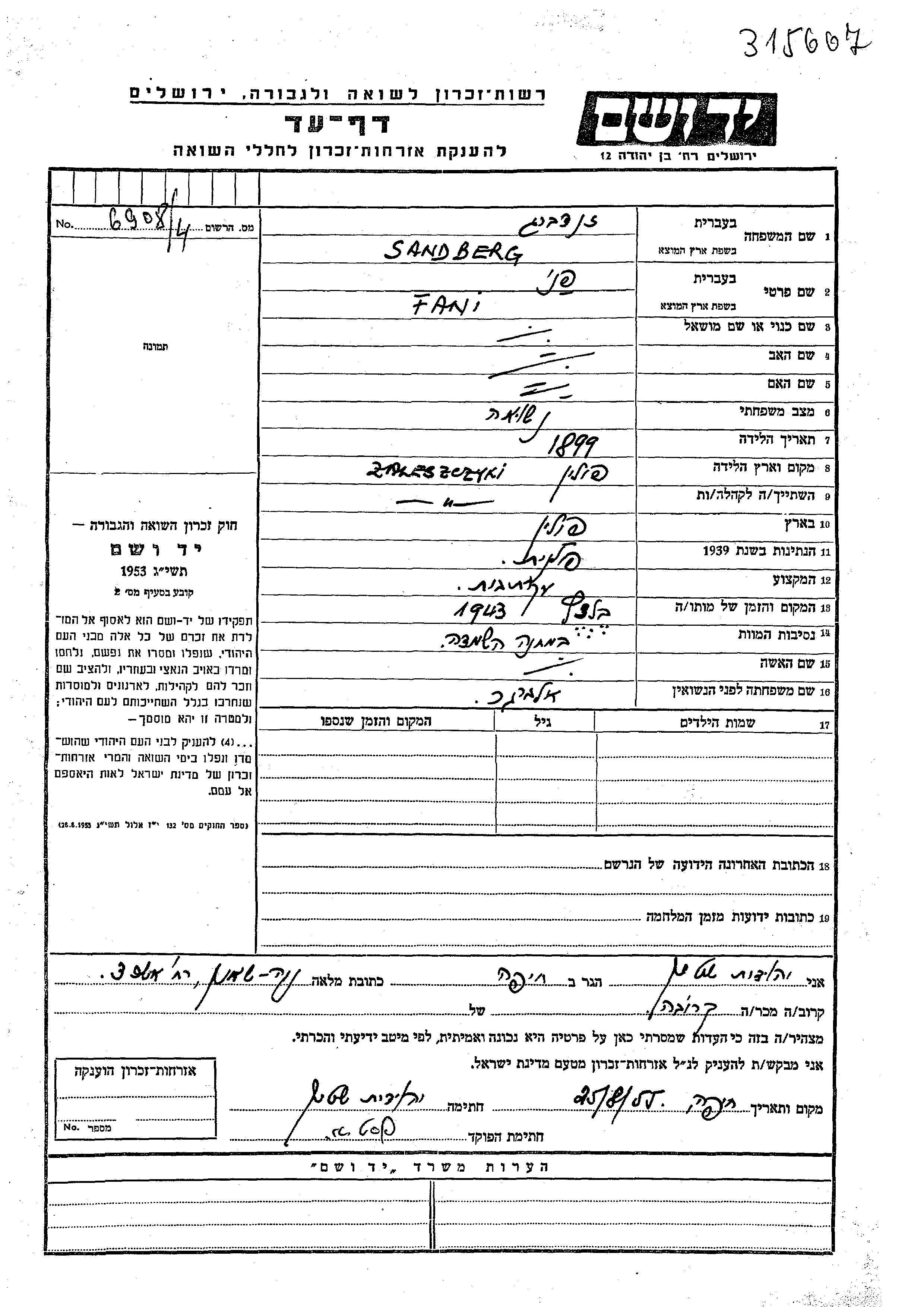 Sandberg Fani 1899 Zaleszcyki, Pologne Feuille de témoignage