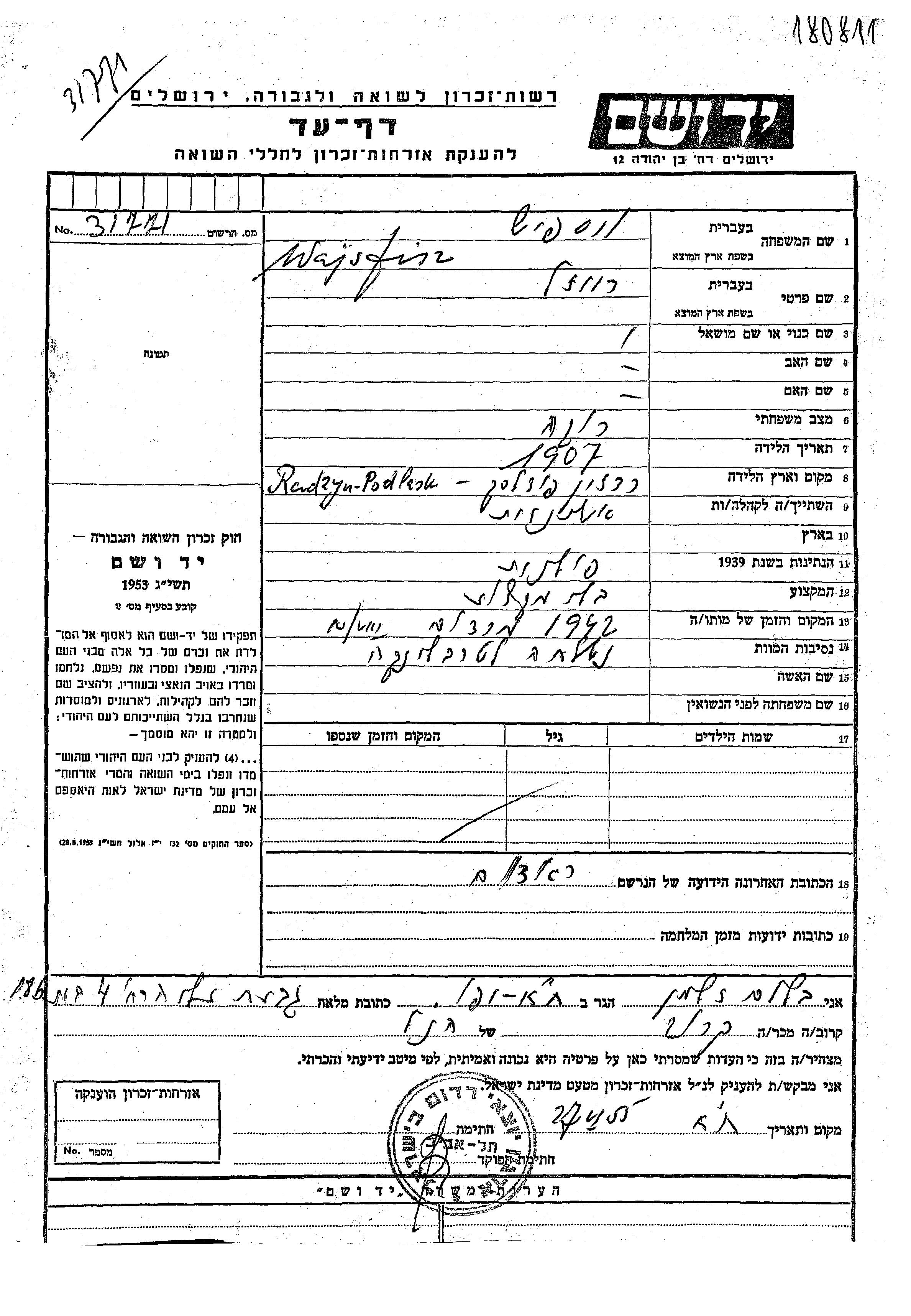 Wajsfisz Reizl 1907 endroit inconnu, Feuille de témoignage