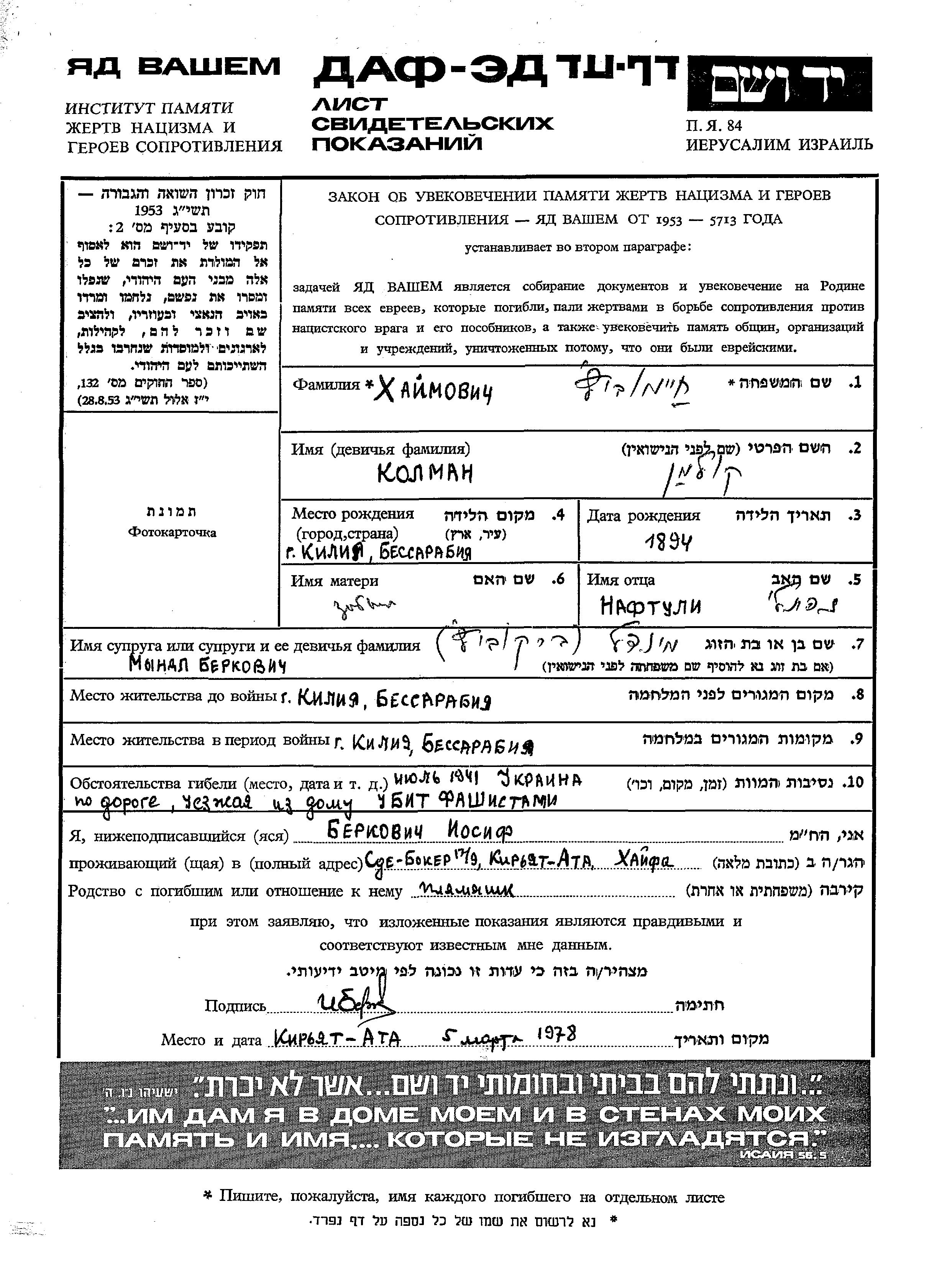 Chaimovicz Kolman 1894 Kiliya, Roumanie Feuille de témoignage
