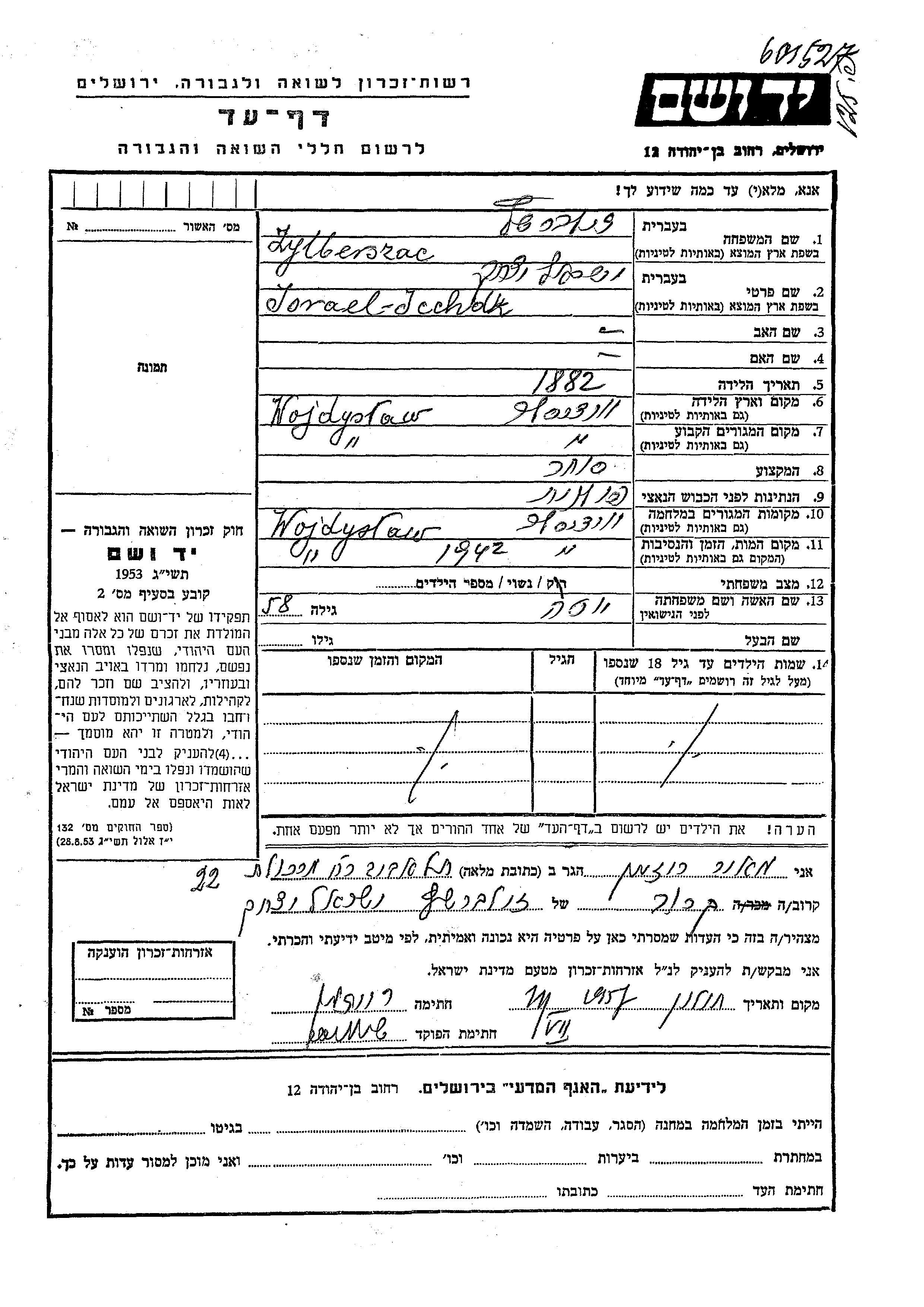 Zylberszac Israel Icchak 1882 Woidislaw, Pologne Feuille de témoignage