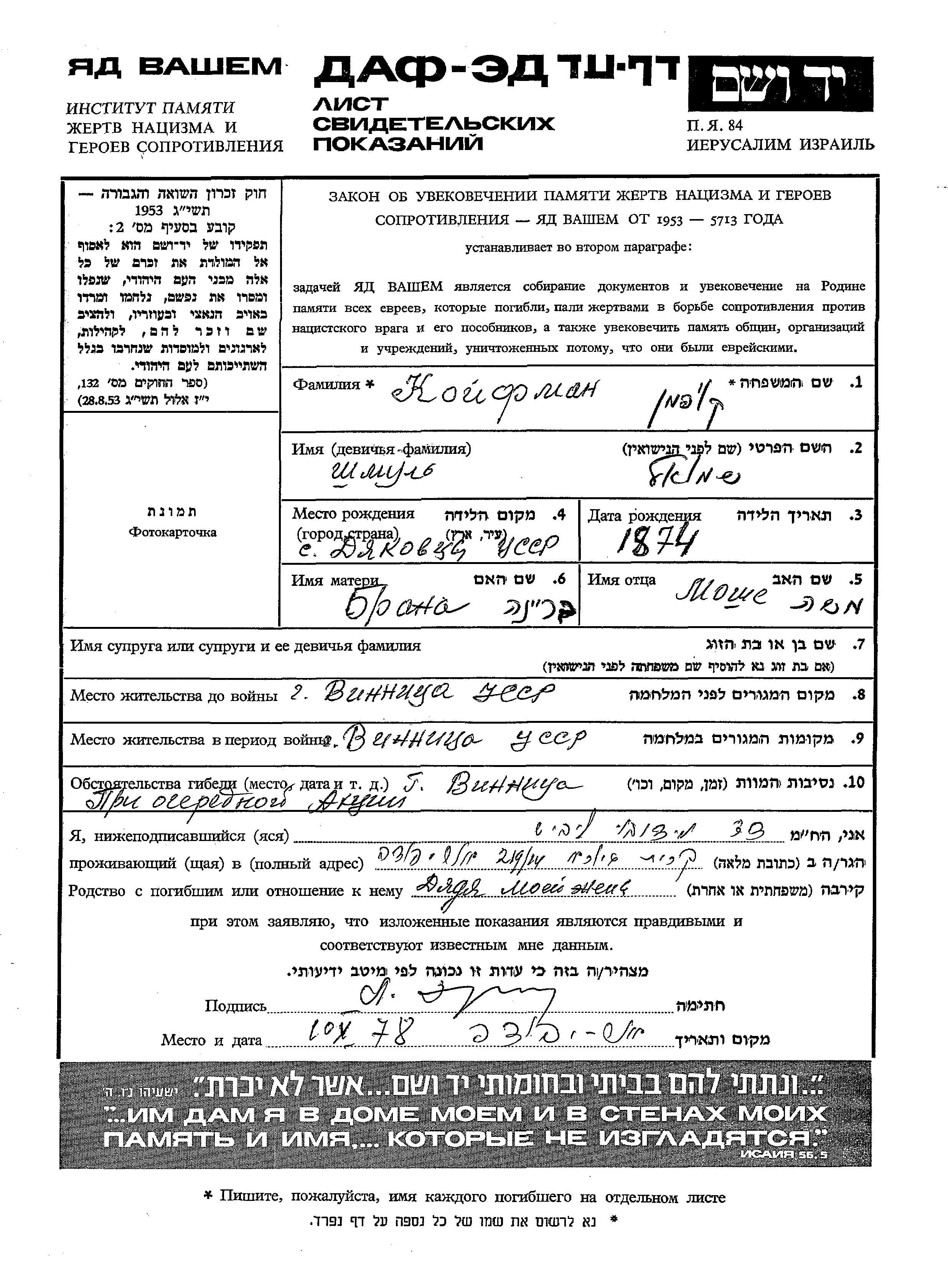 Koifman Shmul 1874 Vinnitsa, Ukraine (URSS) Feuille de témoignage