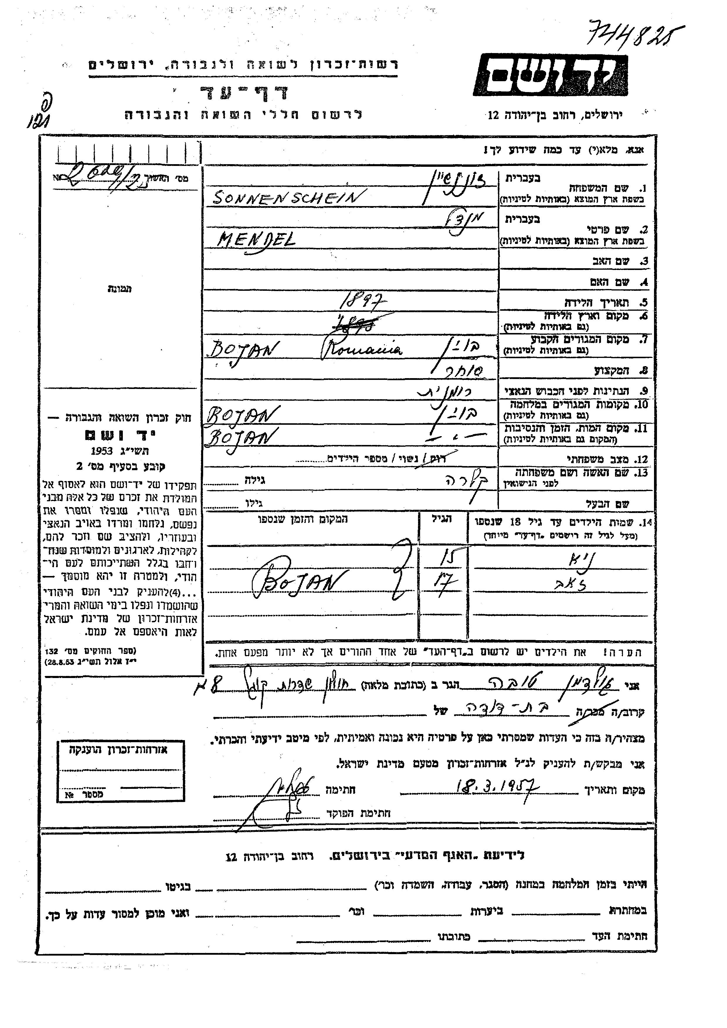 Mendel Sonnenschein est né en 1897. Il était Commerçant/e et Mariée à Klara. Avant la seconde guerre mondiale il vivait à Bojan, Roumanie. Au cours de la guerre, il était à Bojan, Roumanie.
