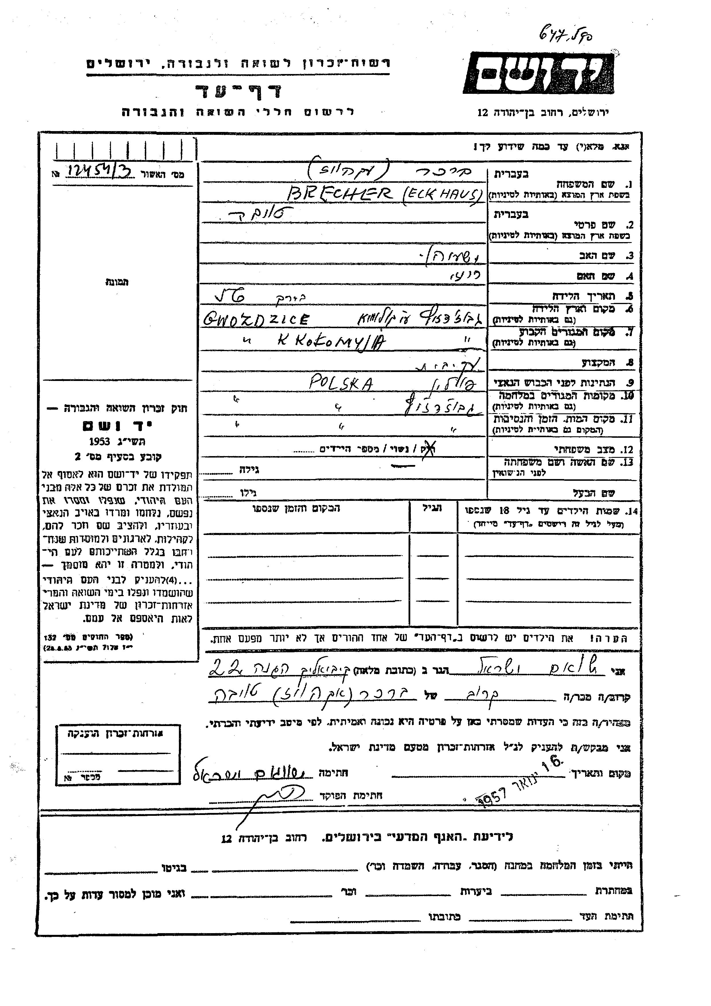 Brecher Eckhaus Toibe Gwozdziec, Pologne Feuille de témoignage
