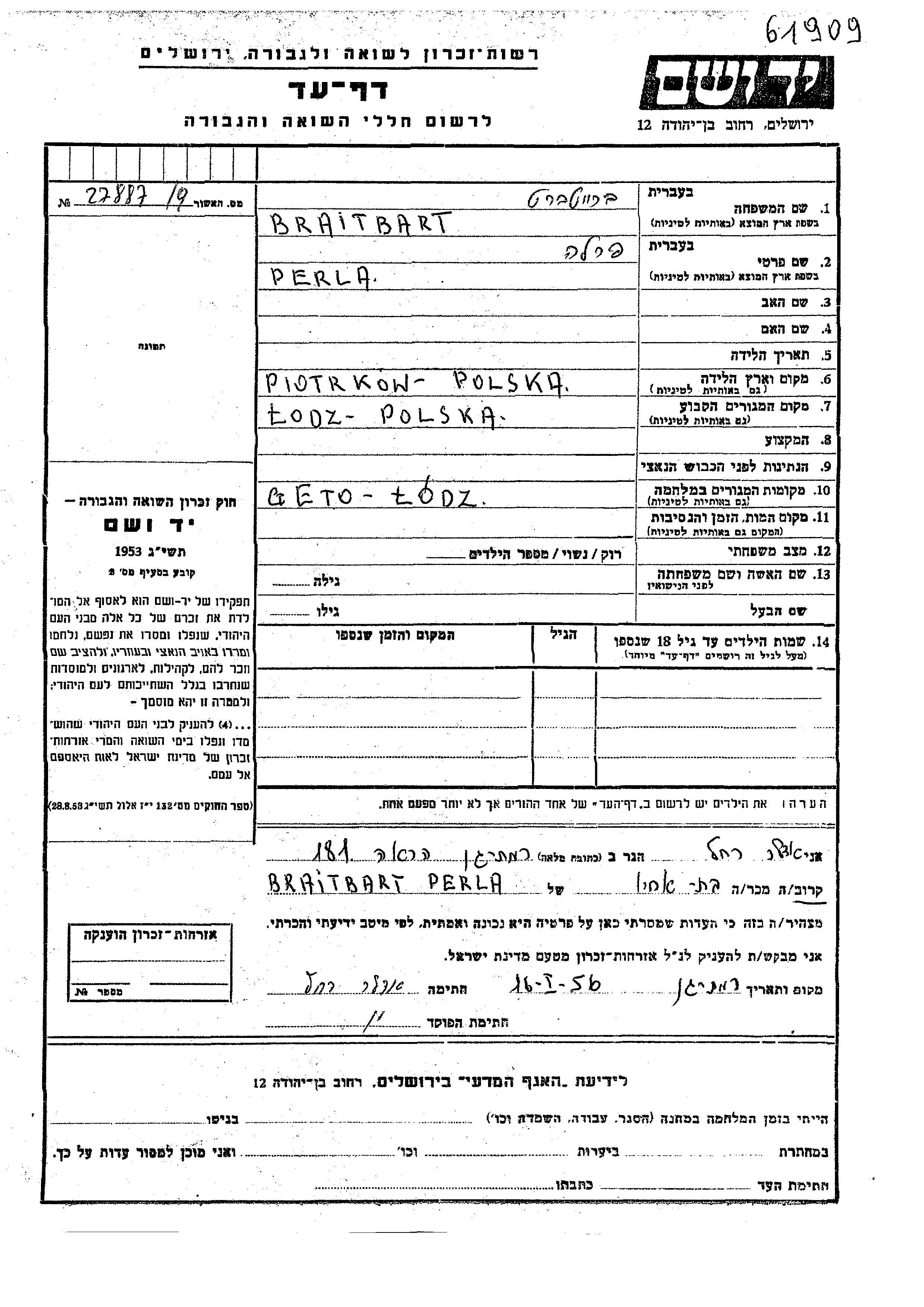 Braitbart Perla Lodz, Pologne Feuille de témoignage