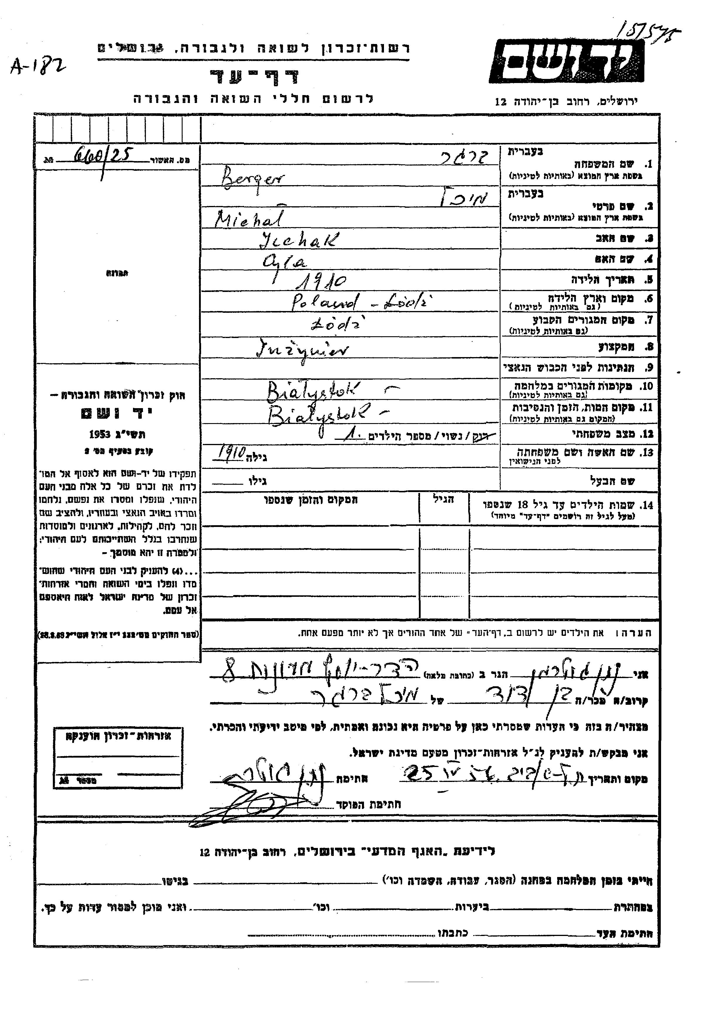 Berger Michal Mikhal 1910 Lodz, Pologne Feuille de témoignage