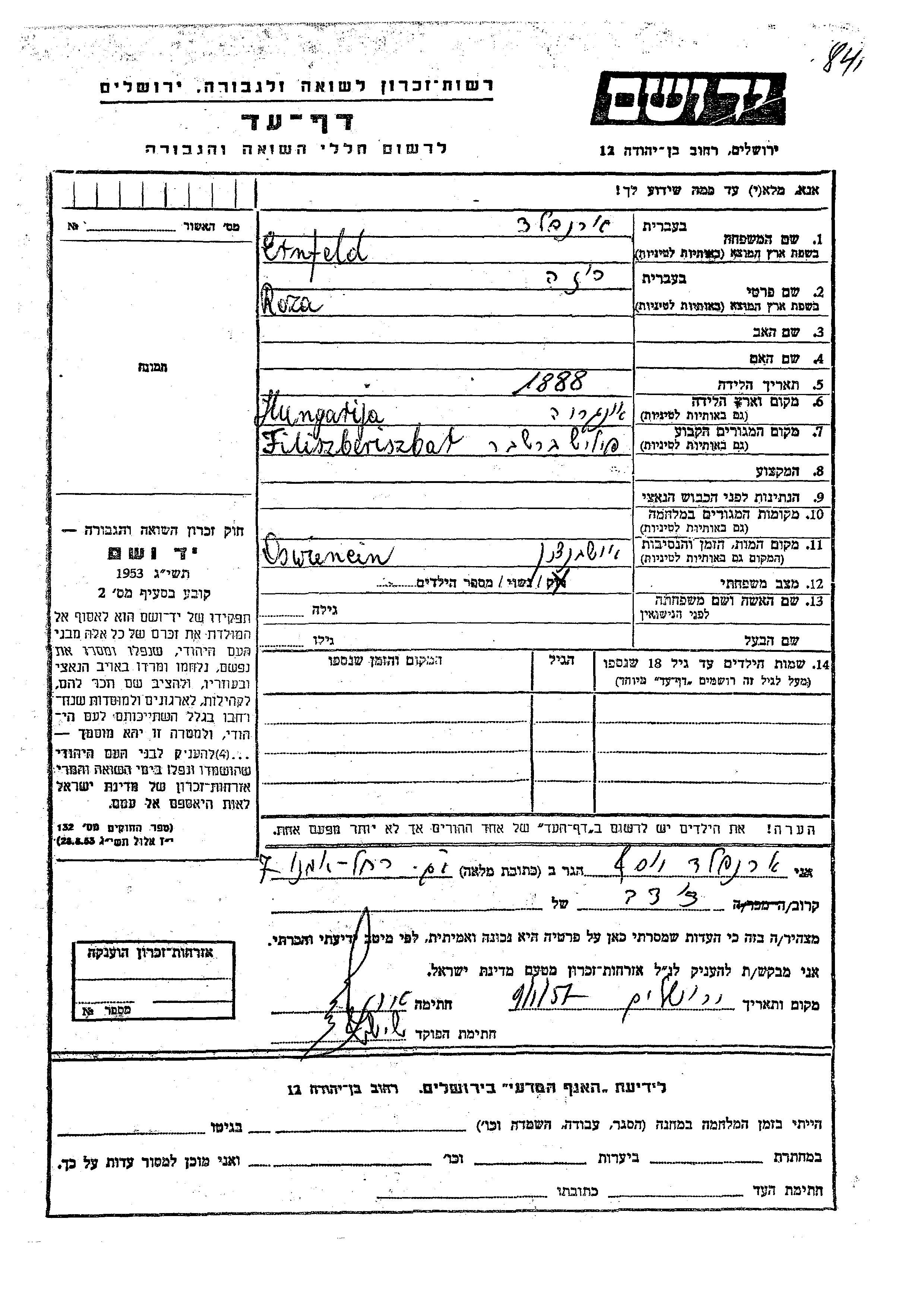 Yad Vashem - Pages of Testimony Names Memorial Collection
