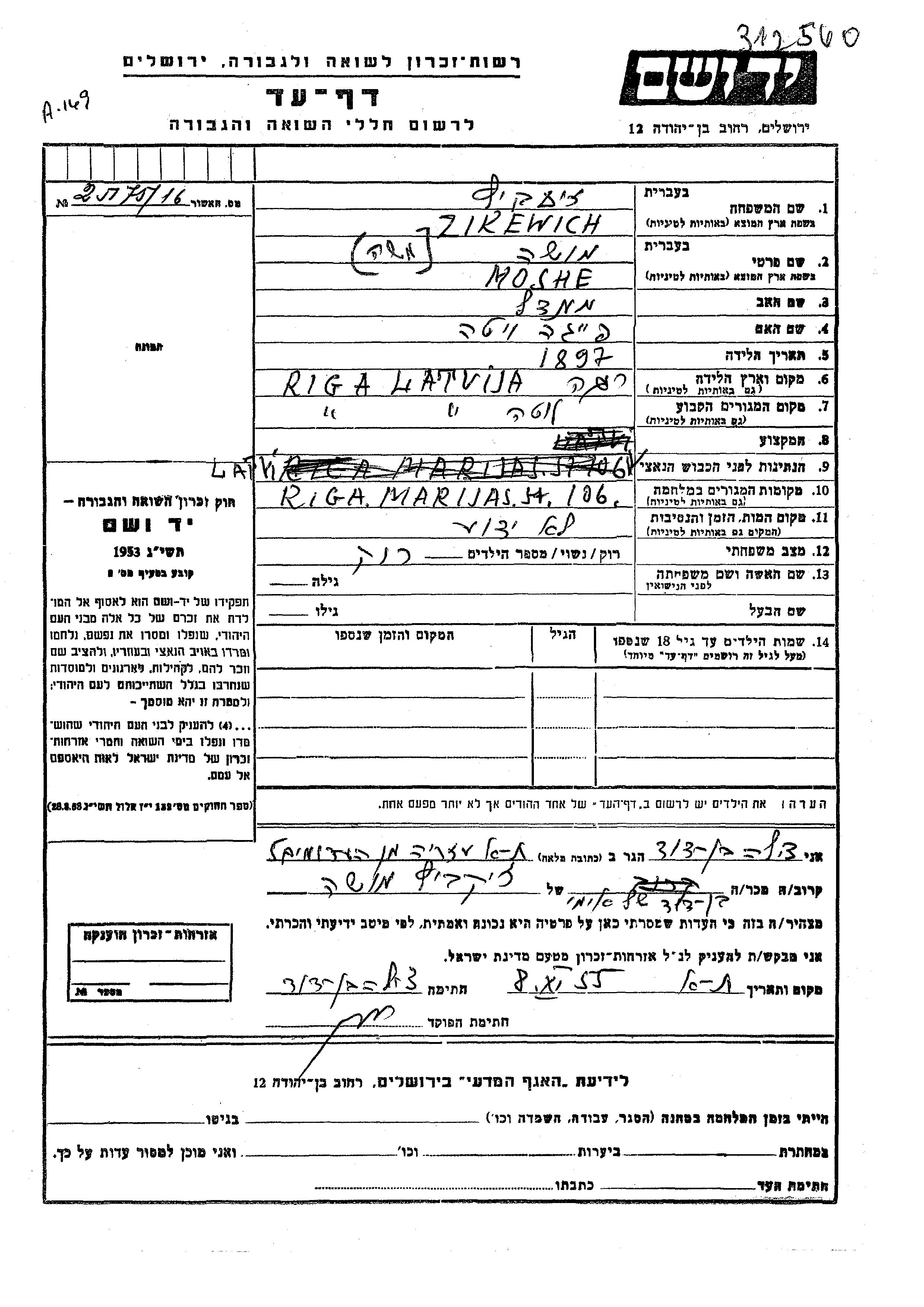 Zikewich Moshe 1897 Riga, Lettonie Feuille de témoignage