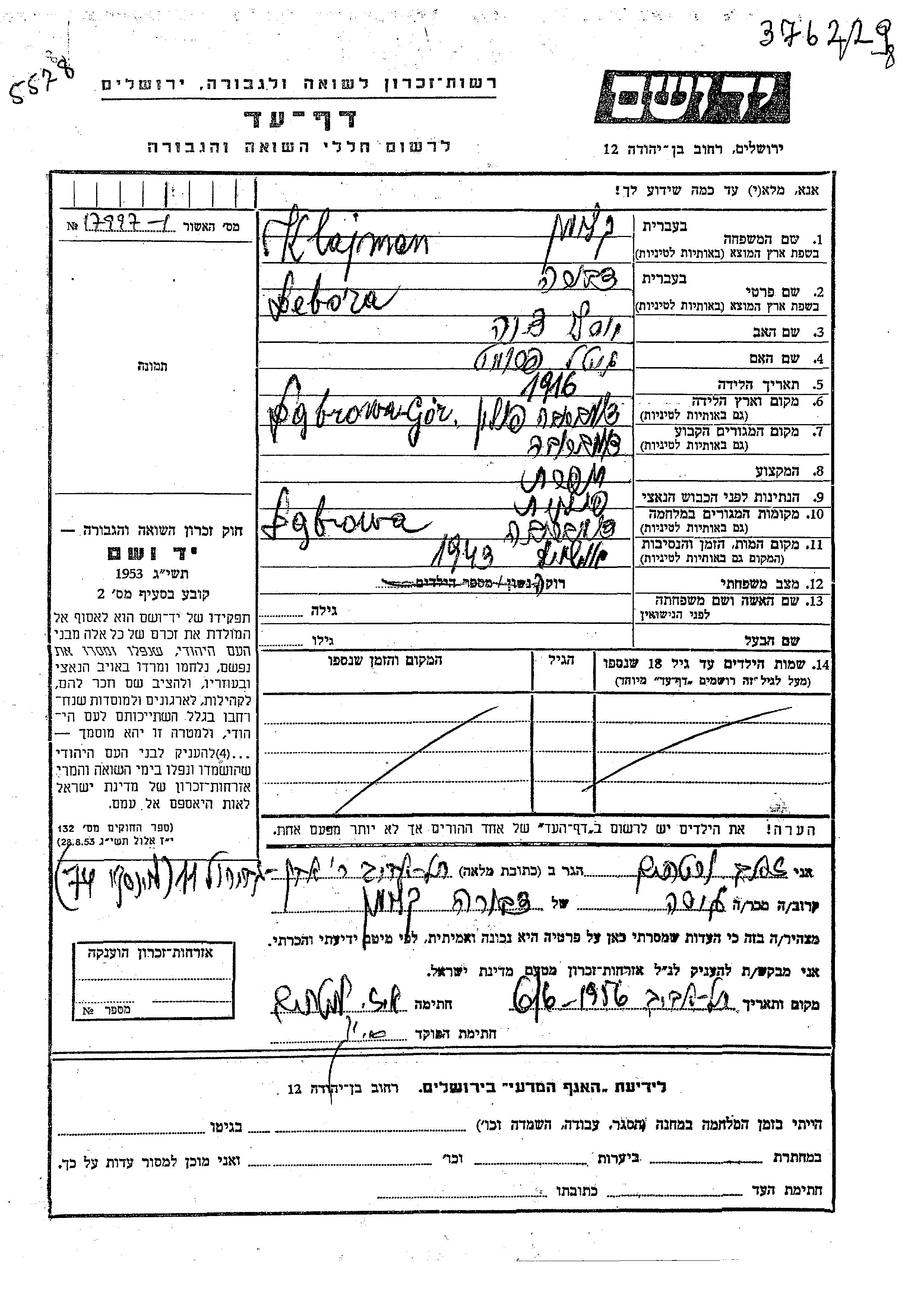 Debora Klajman est née à Dombrova Gurnicha, Pologne en 1916, fille de Yosef Dina et de Gitel Frumet. Elle était Couturière et Célibataire. Avant la seconde guerre mondiale elle vivait à Dombrova Gurnicha, Pologne. Pendant la guerre, elle était à Dombrova Gurnicha, Pologne.