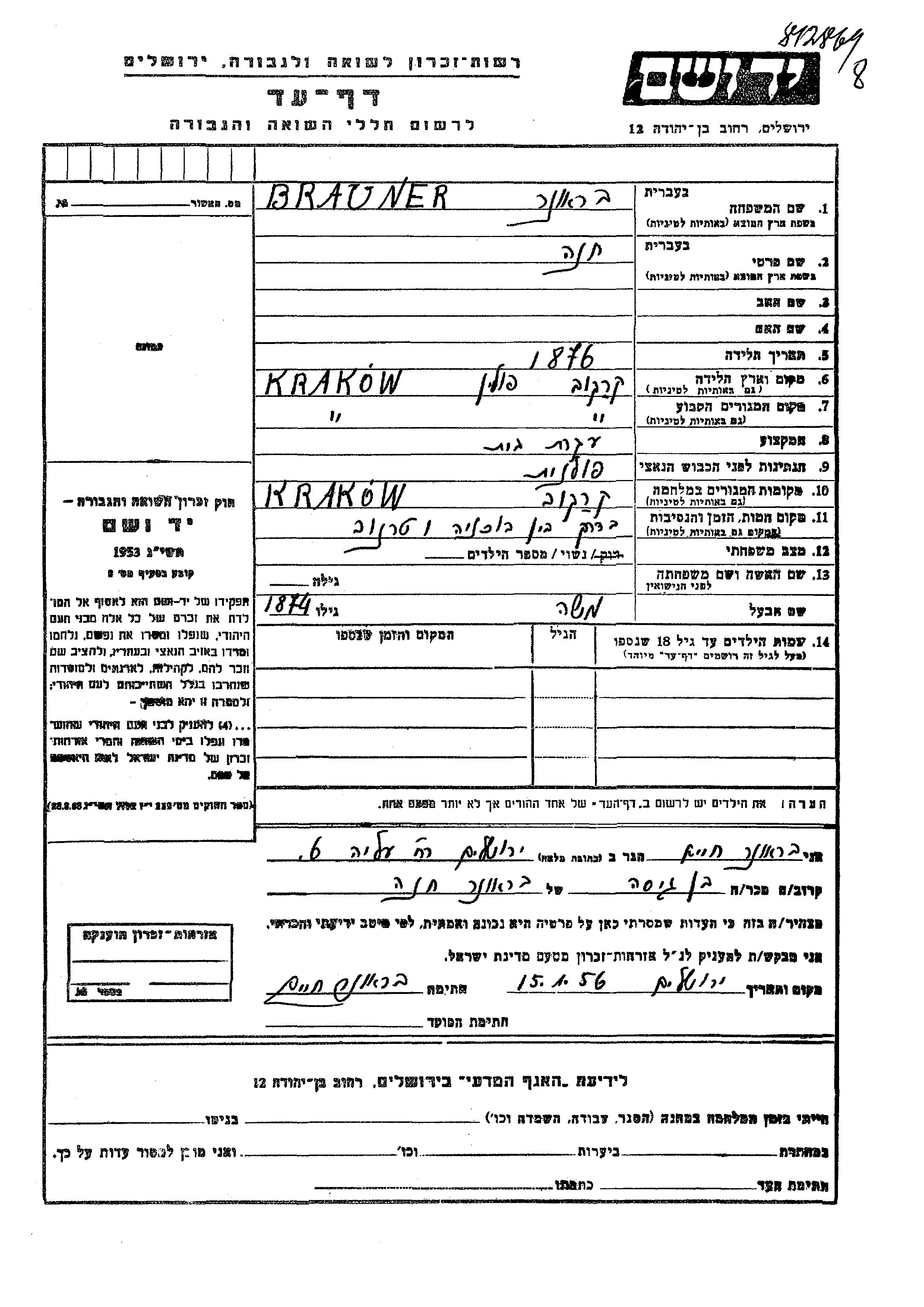 Khana Brauner est née à Krakow, Pologne en 1876. Elle était Femme au foyer et Mariée à Moshe. Avant la seconde guerre mondiale elle vivait à Krakow, Pologne. Pendant la guerre, elle était à Krakow, Pologne.