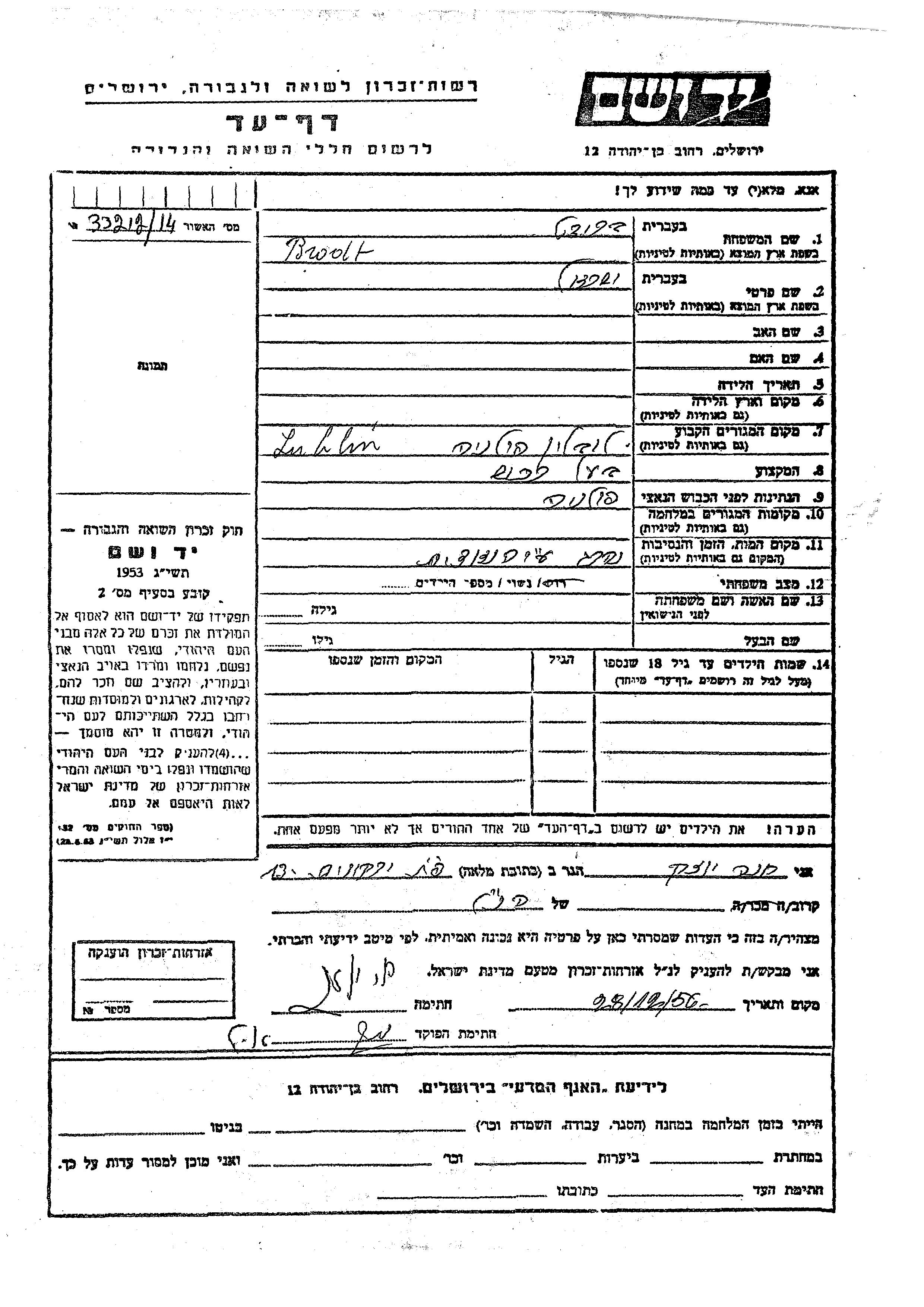 Brodt Yisrael Lublin, Pologne Feuille de témoignage
